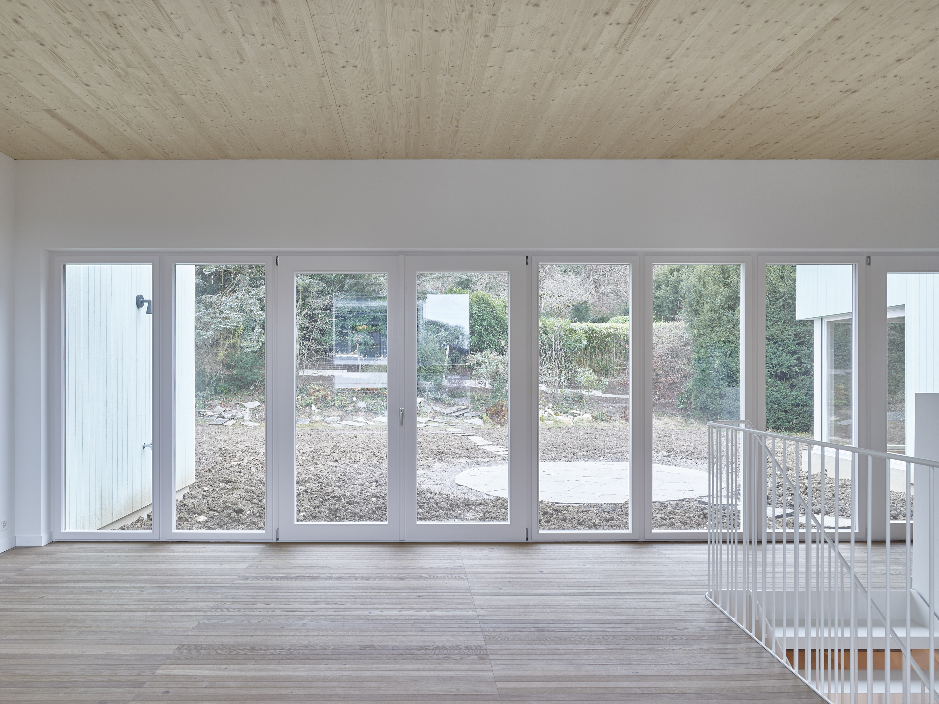Das gesamte Familienleben findet auf einer Ebene im Gartengeschoss statt. Der fliessende Wohn- und Essbereich wird durch die offene Treppe, die Küche und die Hauswirtschaftszone gegliedert. Über präzise gesetzte Fenster entstehen vielfältige Aussenbezüge in den Garten und in die Landschaft. Die Eltern- und Kinderbereiche sind als eigenständige Welten konzipiert. Zimmer, Bäder und Ankleiden verbinden sich zu farbigen, spielerisch erlebbaren Rundläufen.