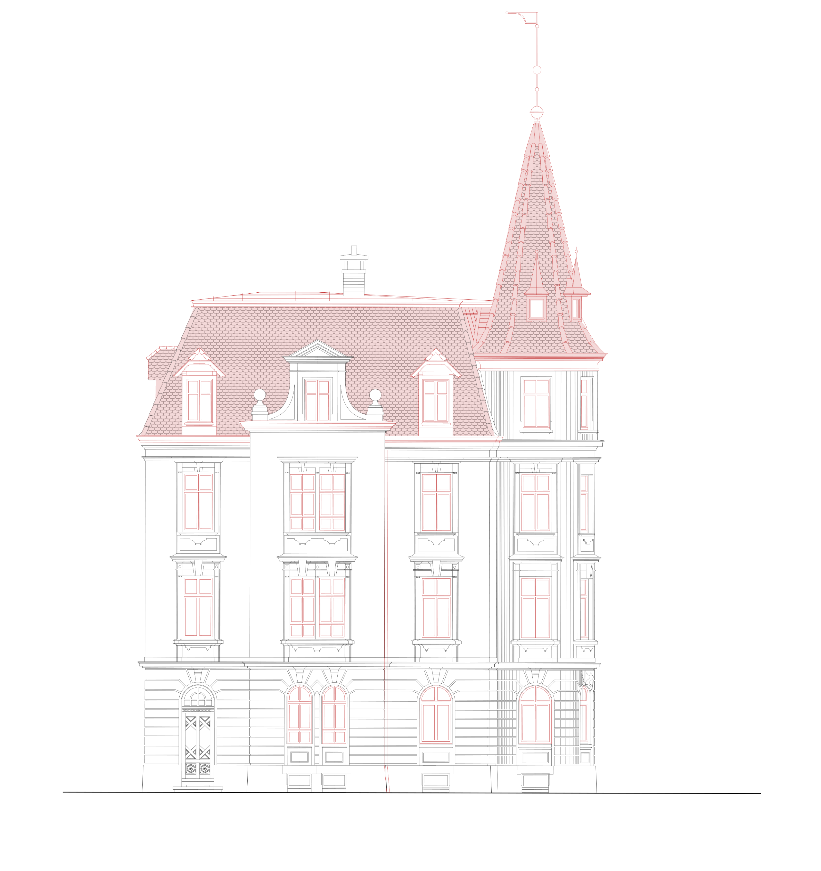 Das gesamte Dach inklusive aller Gauben wurde gedämmt und die aufwändigen Spenglerarbeiten wurden erneuert. Im Mansardengeschoss wurde eine zusätzlich Wohnung eingebaut. Die Fenster aus den siebziger Jahren wurden mit, dem historischen Charakter entsprechenden, Holzfenstern ersetzt. Der Erhalt möglichst aller historischen Bauelemente stand im Vordergrund. Wo immer möglich wurde repariert und ergänzt.