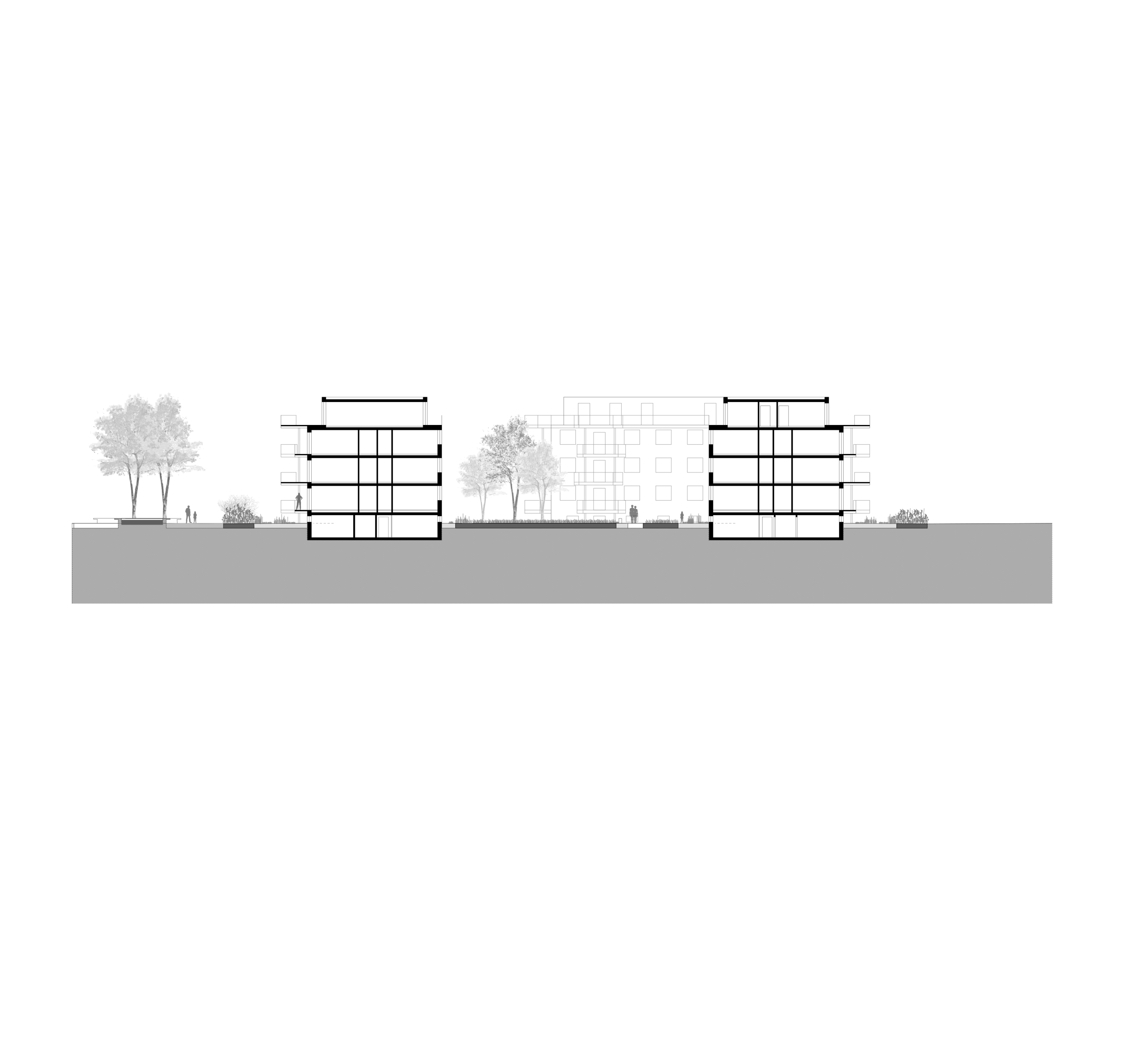 Die Fassaden werden mit Aussendämmung als preisgünstigster Konstruktionsmöglichkeit vorgeschlagen. Die beiden Baukörper sind kompakt und mit einfachen Lochfenstern in einem regelmässigen Rhythmus gegliedert. Die Fenster sind mit 1.60/1.50m ohne Sturz, die Balkontüren mit Sturz 1.20/2.20m vorgesehen.