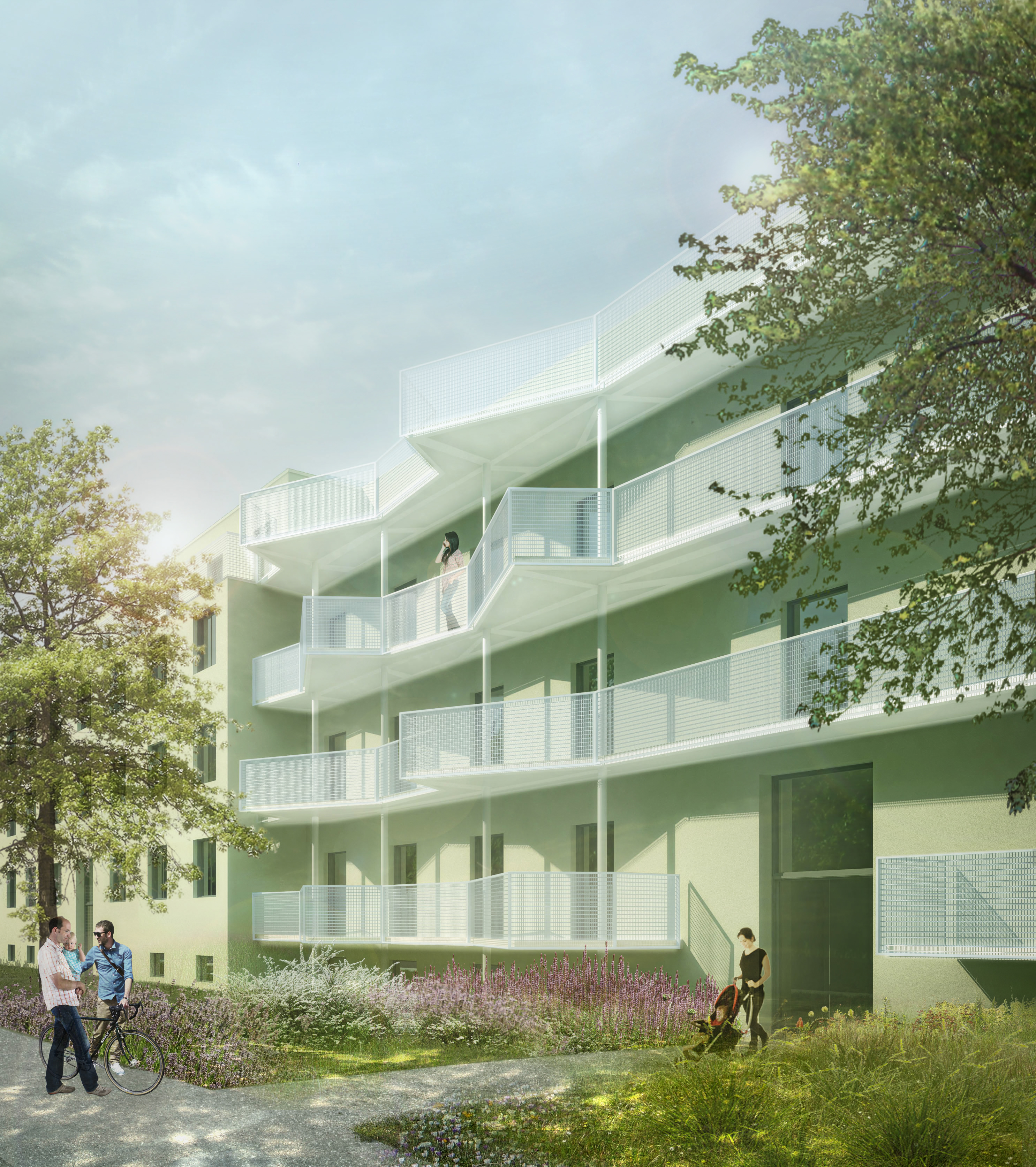 Die Strenge dieser pragmatischen Grunddisposition wird durch die spielerisch anmutende Positionierung der Balkone gelockert. Sie sind als konstruktiv unabhängige Stahlkonstruktionen vor den aussen gedämmten Fassaden angeordnet. Jeder Balkon misst 9m2 Grundfläche und wird im Wechsel übereinander gespiegelt angeordnet, so dass je ein gedeckter und ein freier Balkonteil entstehen. Bei den Strassen- bzw. Zugangsseiten werden die Balkone zudem untereinander verbunden, wodurch eine feingliedrige Gesamterscheinung erreicht wird.