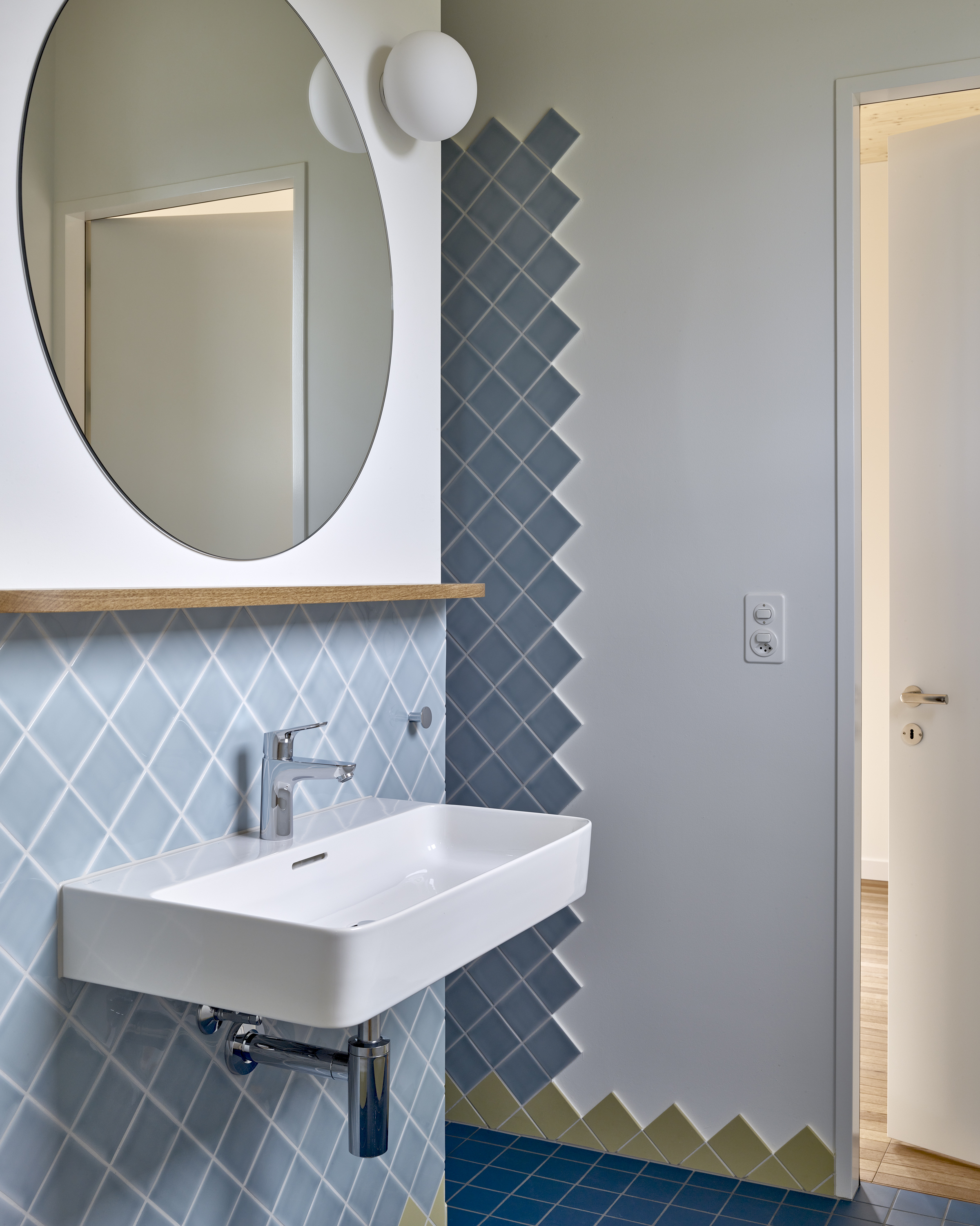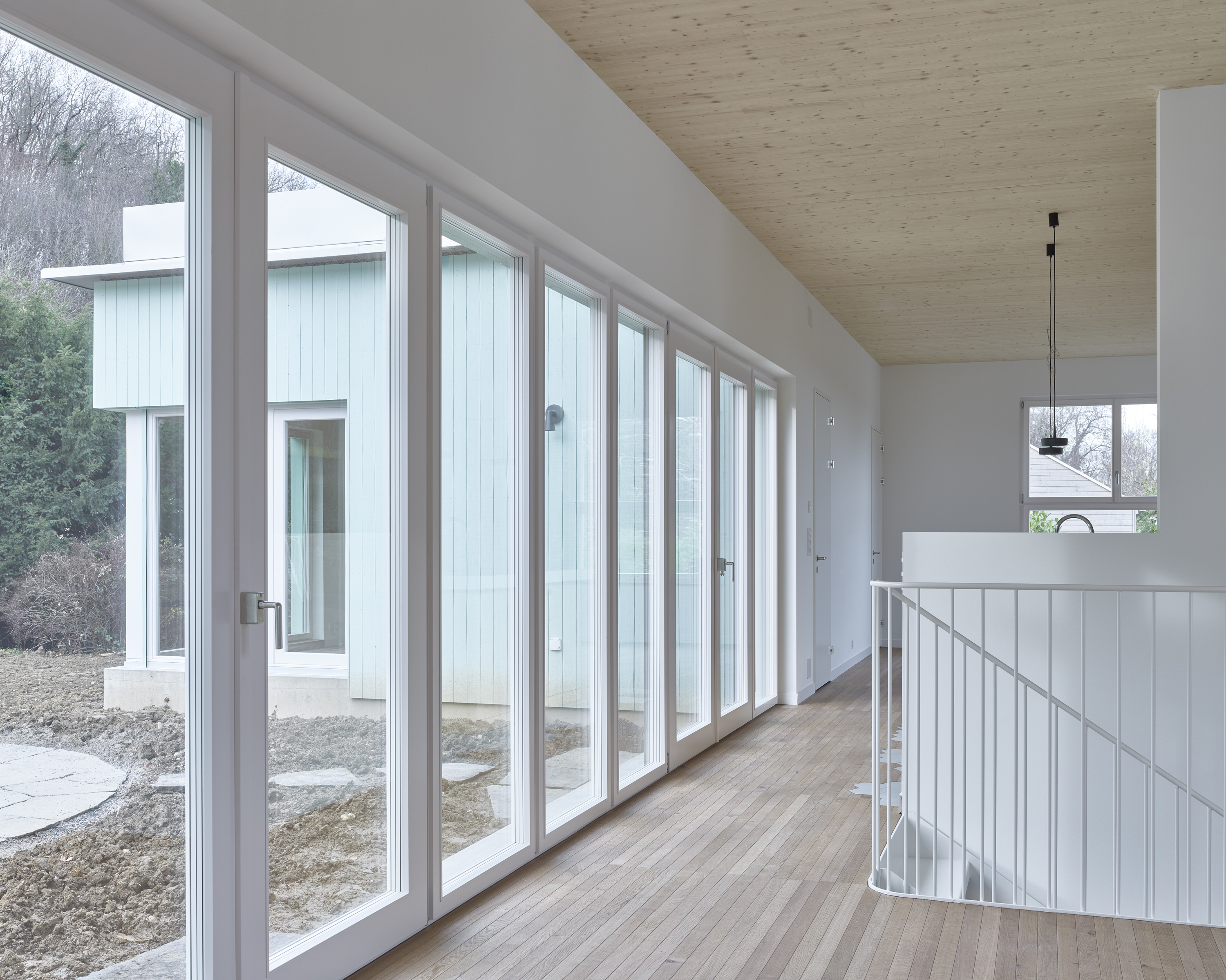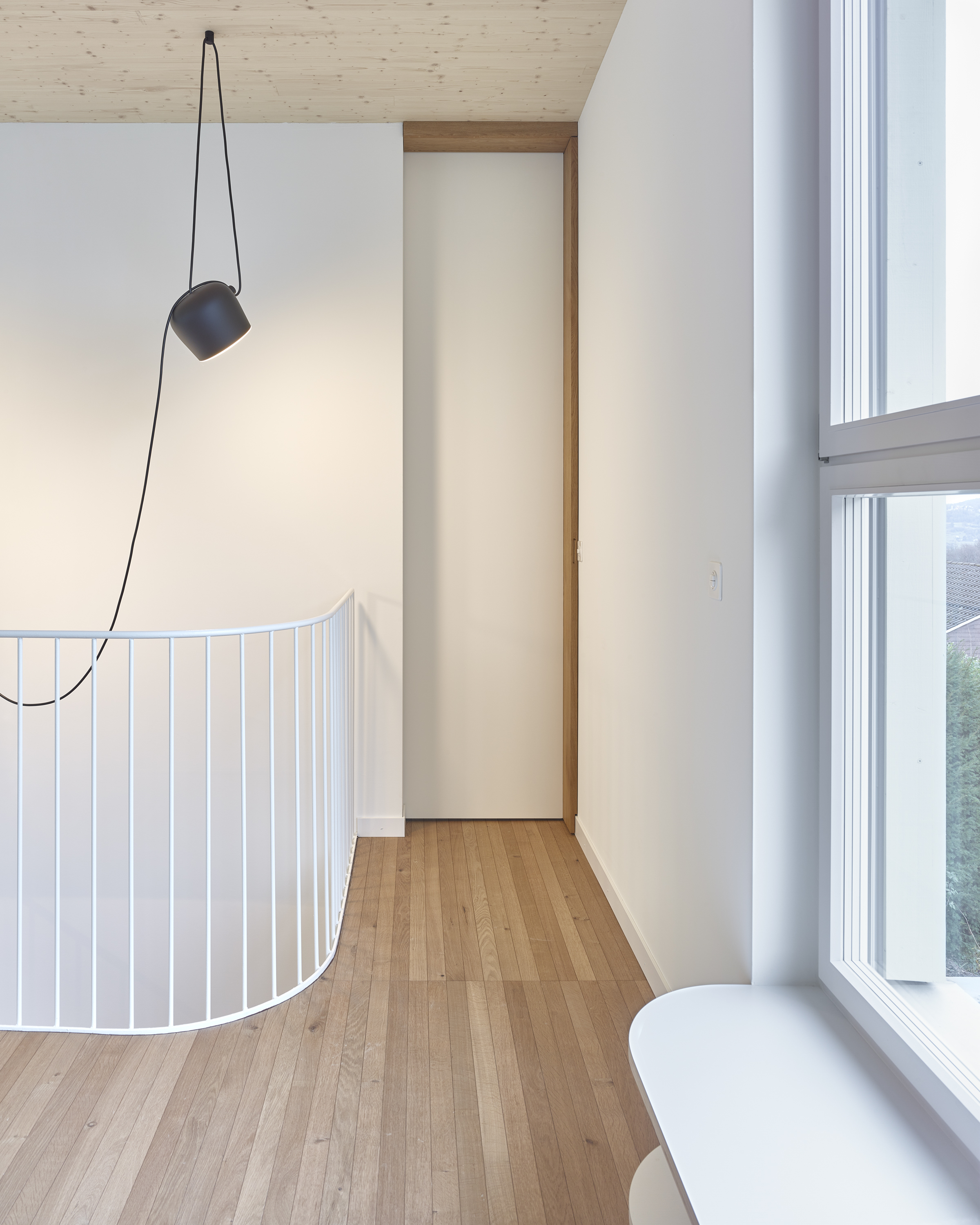 Das gesamte Familienleben findet auf einer Ebene im Gartengeschoss statt. Der fliessende Wohn- und Essbereich wird durch die offene Treppe, die Küche und die Hauswirtschaftszone gegliedert. Über präzise gesetzte Fenster entstehen vielfältige Aussenbezüge in den Garten und in die Landschaft. Die Eltern- und Kinderbereiche sind als eigenständige Welten konzipiert. Zimmer, Bäder und Ankleiden verbinden sich zu farbigen, spielerisch erlebbaren Rundläufen.