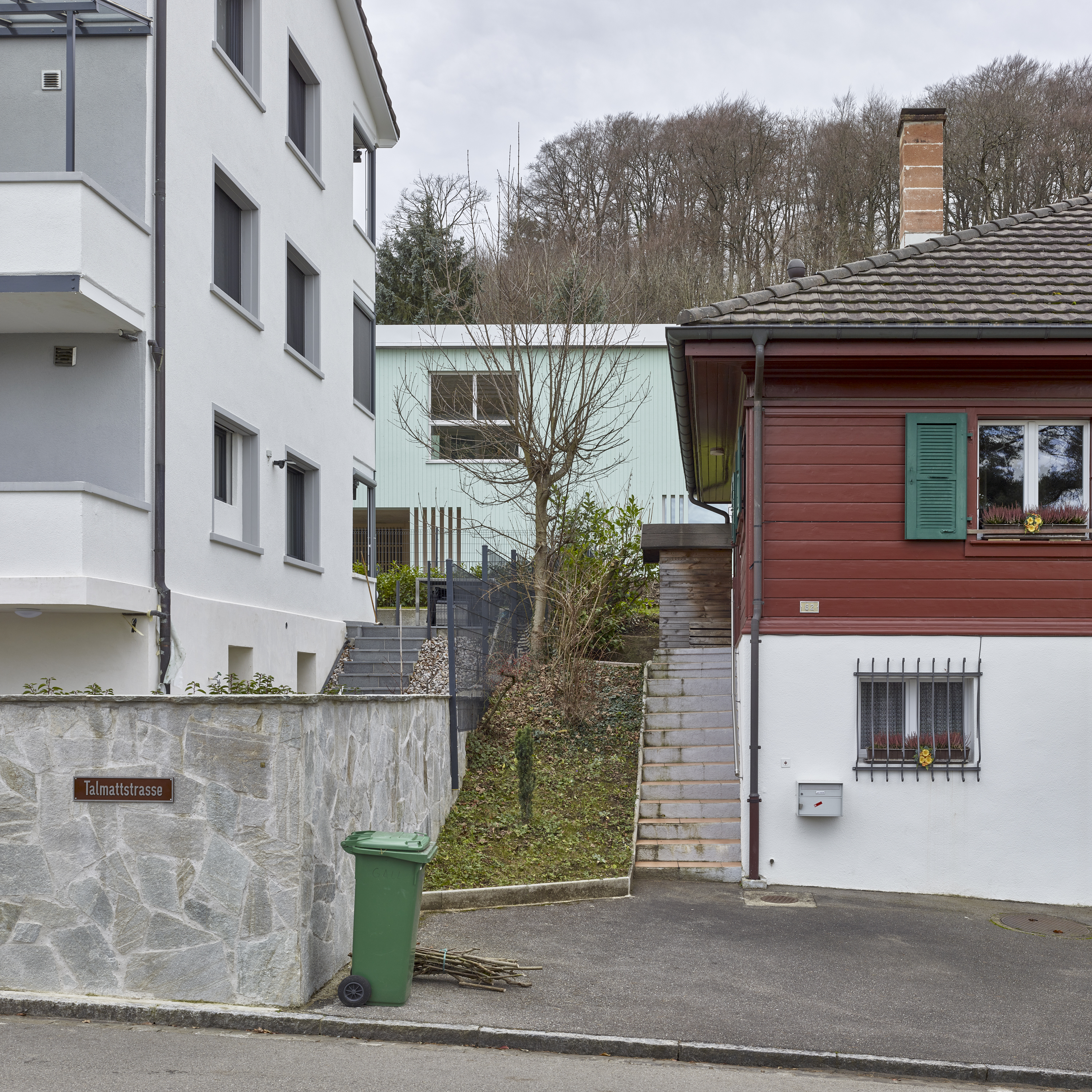 Die Holzelementbauweise mit Holzwolldämmung und Fichtenschalung mit Anstrich in Thymos Farben, der Entscheid für eine Teilunterkellerung zur Minimierung des Aushubs, sowie der Einsatz einer Erdsonden-Wärmepumpe und einer Photovoltaikanlage machen das Einfamilienhaus vorbildlich im Sinne der Nachhaltigkeit.
