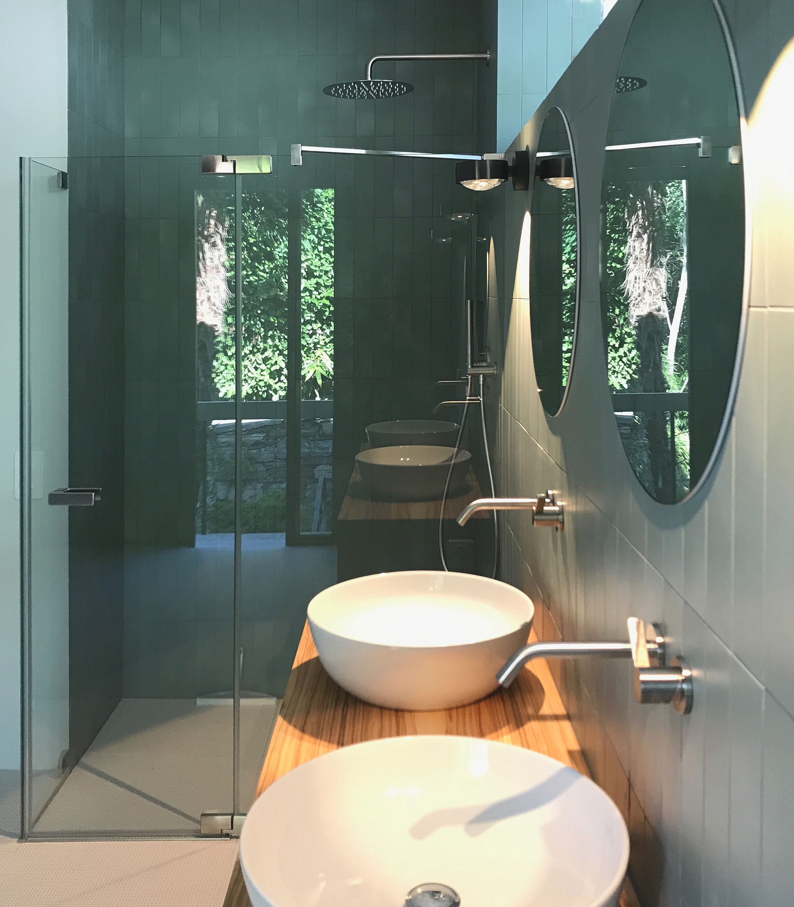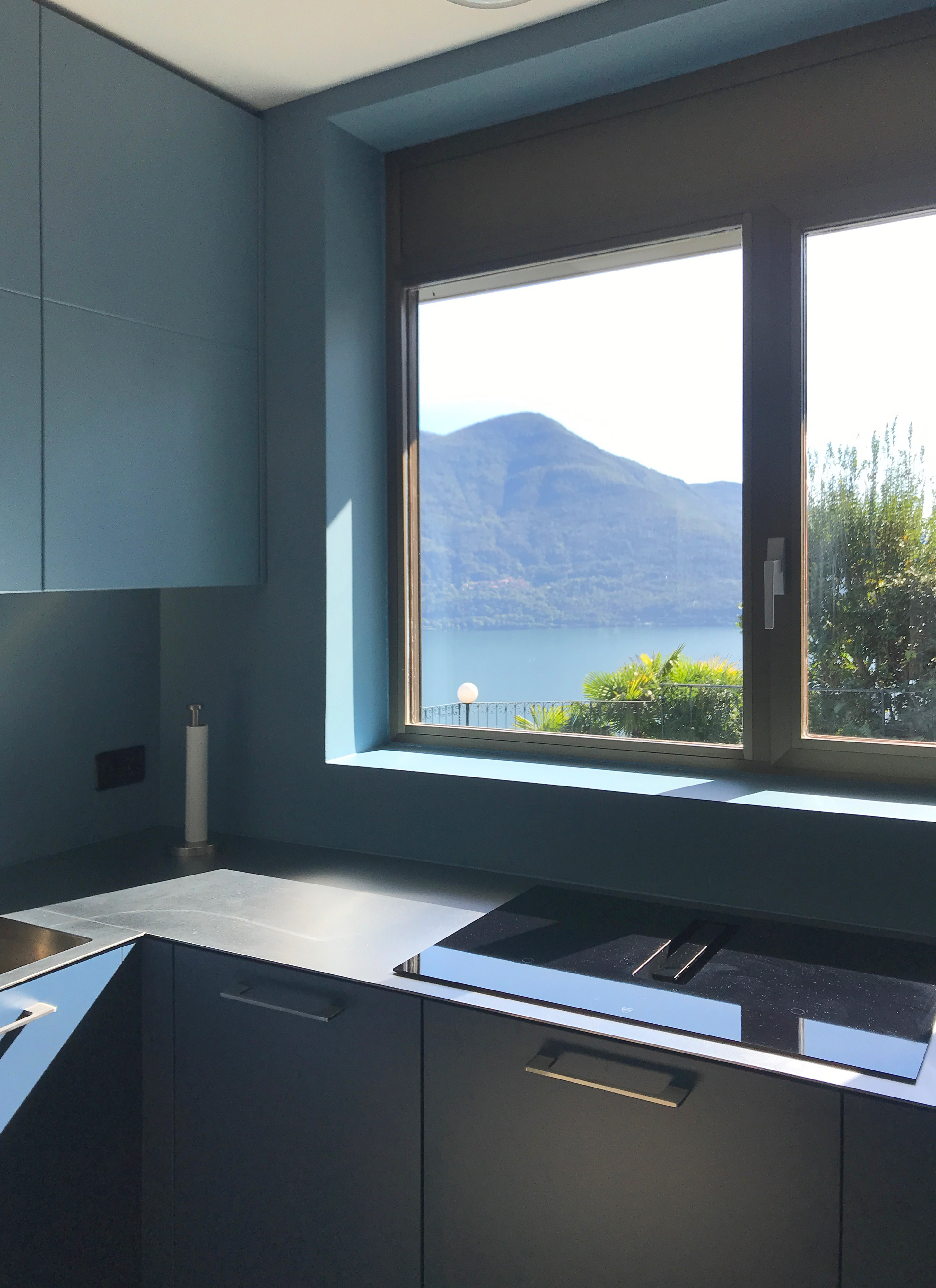 Das hoch über dem Lago Maggiore gelegene Ferienhaus erinnert an die Case Study Houses der kalifornischen Nachkriegsmoderne. Sein Äusseres wird aufgefrischt. Die Innenräume werden durch den Einsatz von Farben neu interpretiert. Es entsteht eine überraschende Raumbeziehung zwischen dem bestehenden in dunklem Holz verkleideten Wohnzimmer und der neuen, in Blau gehaltenen Küche. Ursprünglich als Arbeitsküche konzipiert, erhält die neue Küche als Raum nun ihren eigenen Wert. Sie verbindet sich mit dem Tiefenraum des Lago Maggiore. Das grüne Bad öffnet sich zum rückwärtigen Garten. Durch die Farbigkeit der Innenräume gelingt es, diese sinnlich mit den Landschaftsräumen zu verzahnen.