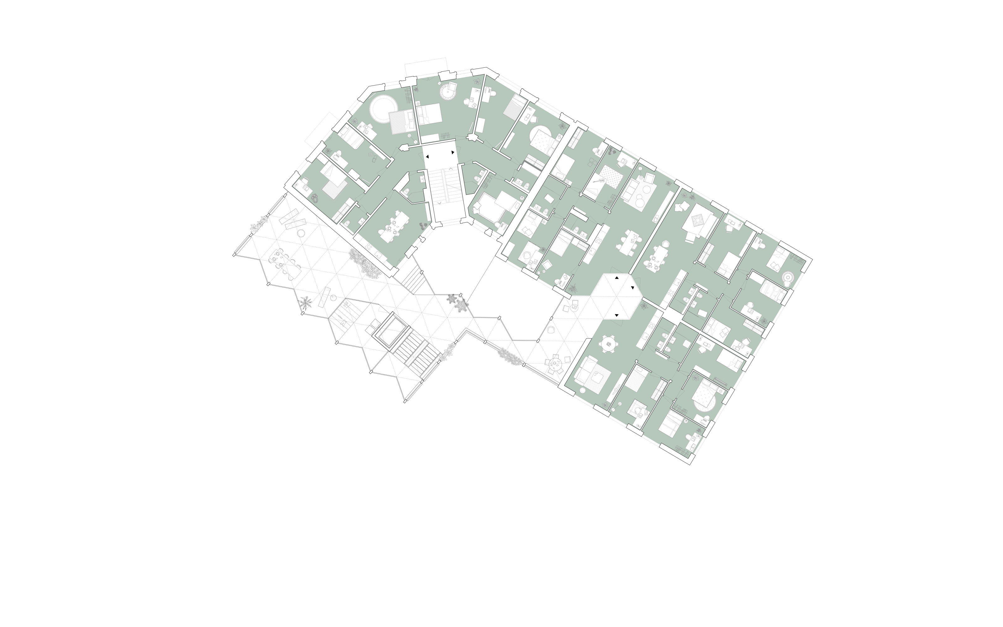 Es entsteht ein gemeinschaftlicher Gartenraum mit der grossen Terrasse, Spielflächen, einem Grill und Pflanzbeeten. Hier findet das nachbarschaftliche Leben des Ensembles statt. Die Terrassen werden durch Pflanzen und Blumen zu üppigen Geschossgärten.