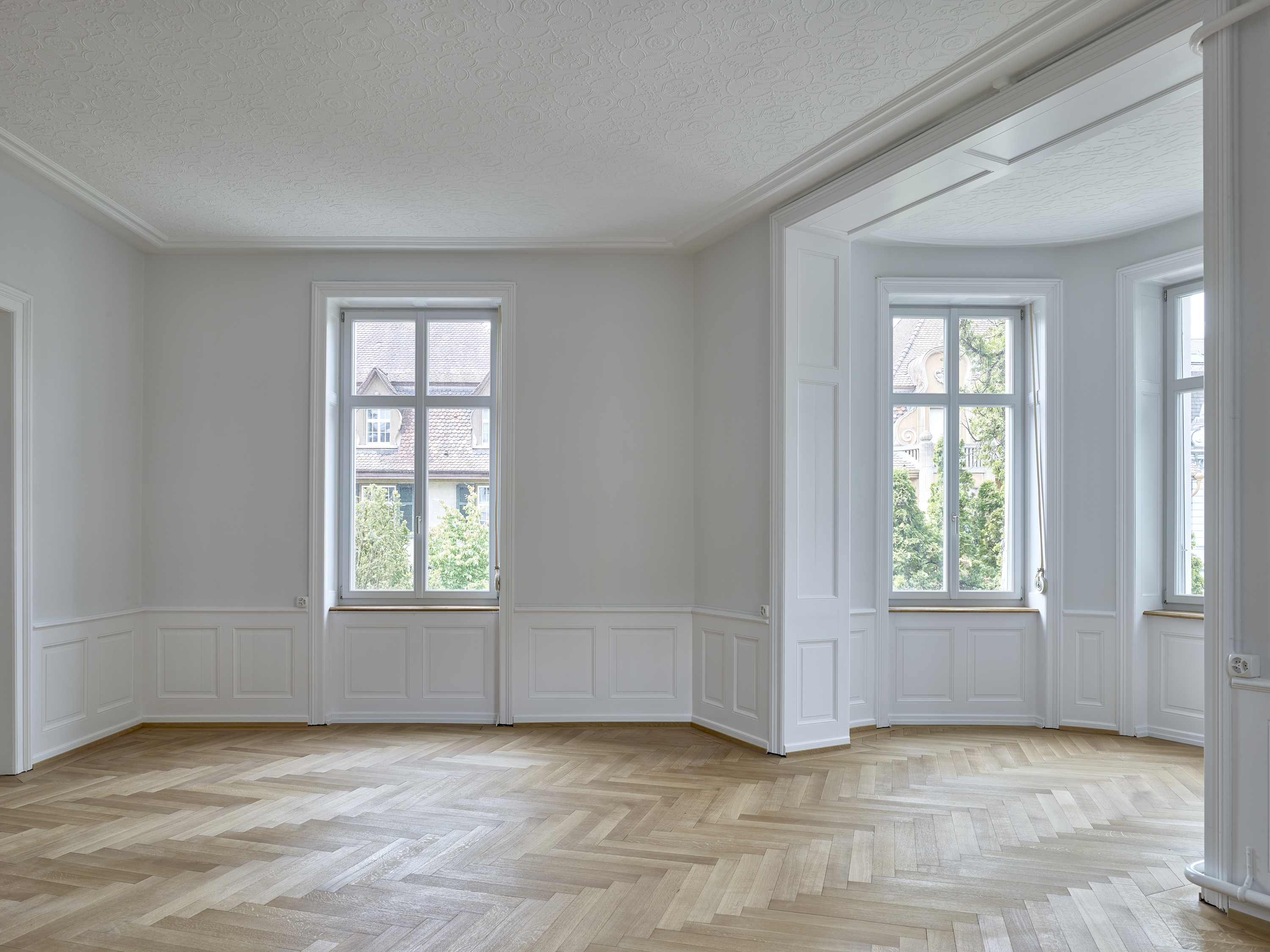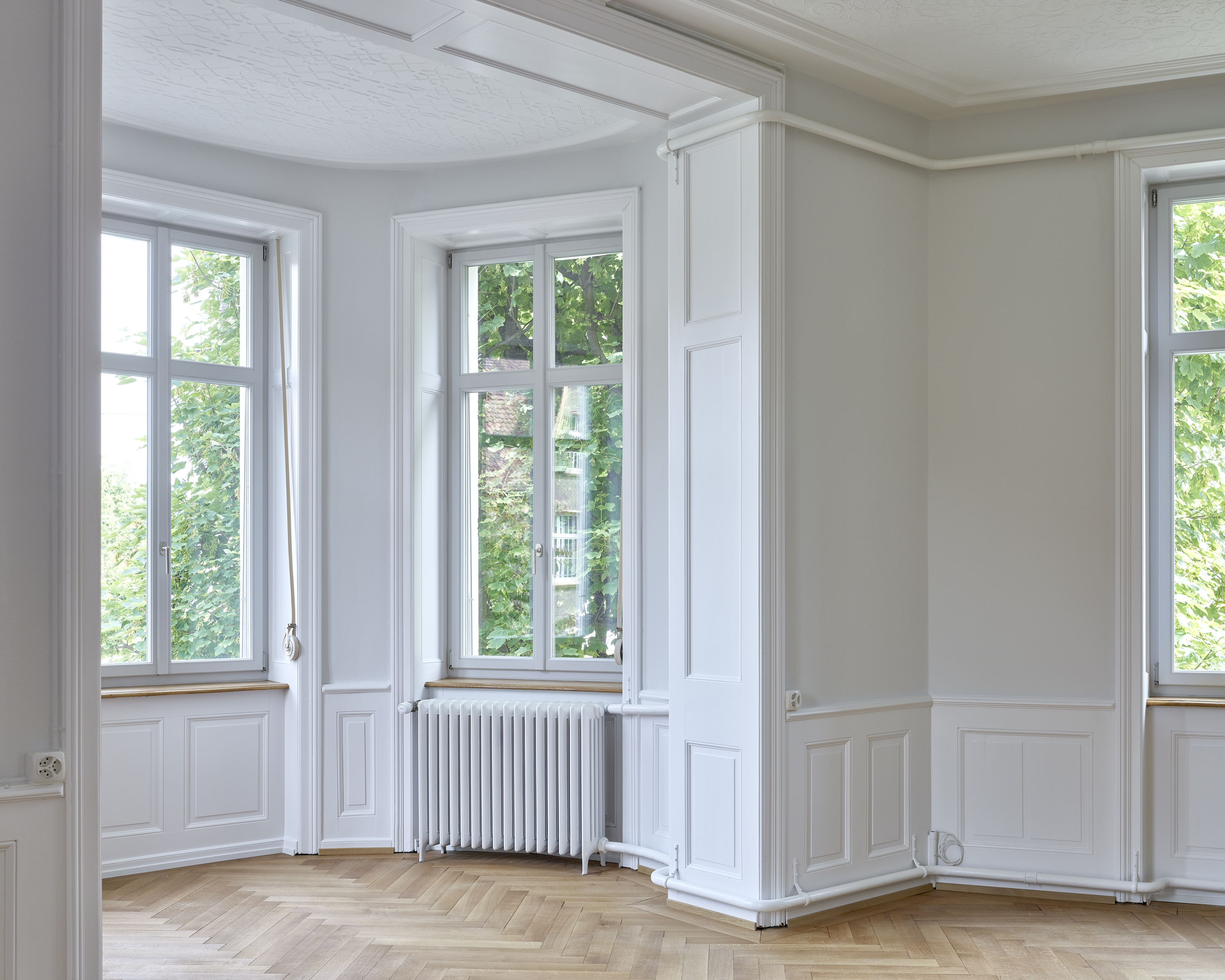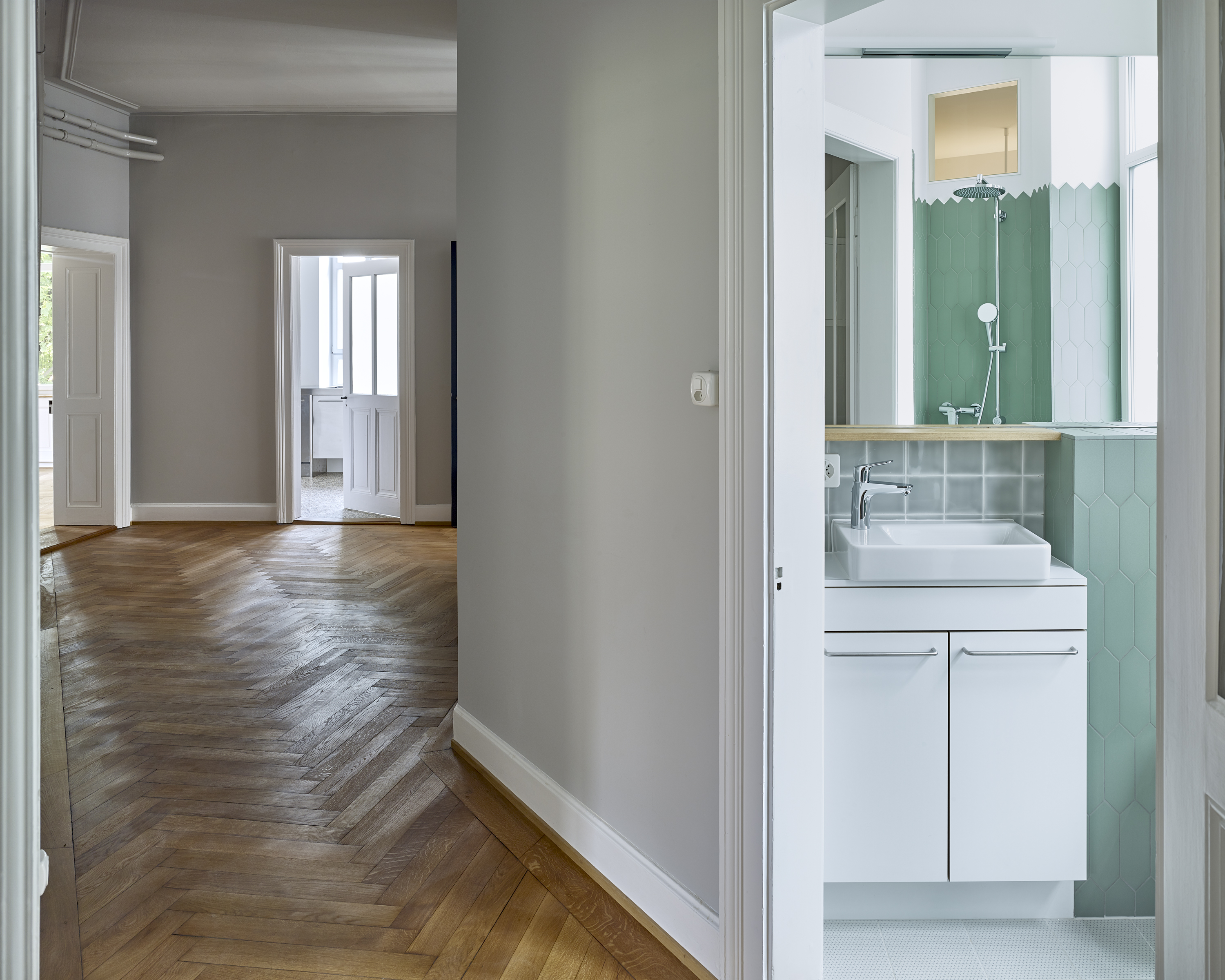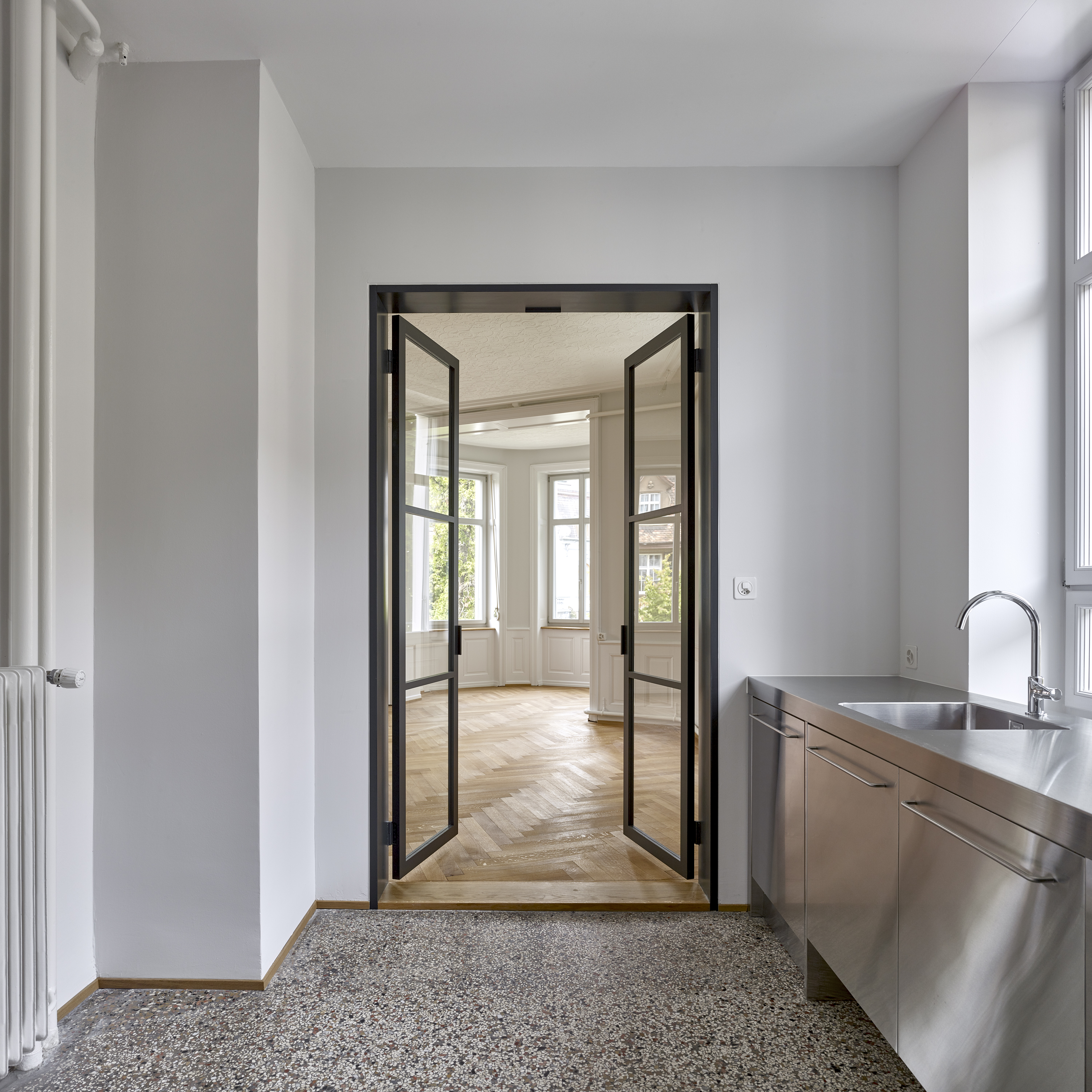 Im Inneren wurden die grossbürgerlichen Raumfolgen sorgfältig saniert. Als neues Element erhielt jede Wohnung eine grosszügige Küche, welche sich über transparente Doppelflügeltüren mit der bestehende Raumfolge verbindet. Eine besonders sorgfältige Material- und Farbwahl schaffen eine neue Grosszügigkeit in den kleinen Bädern.