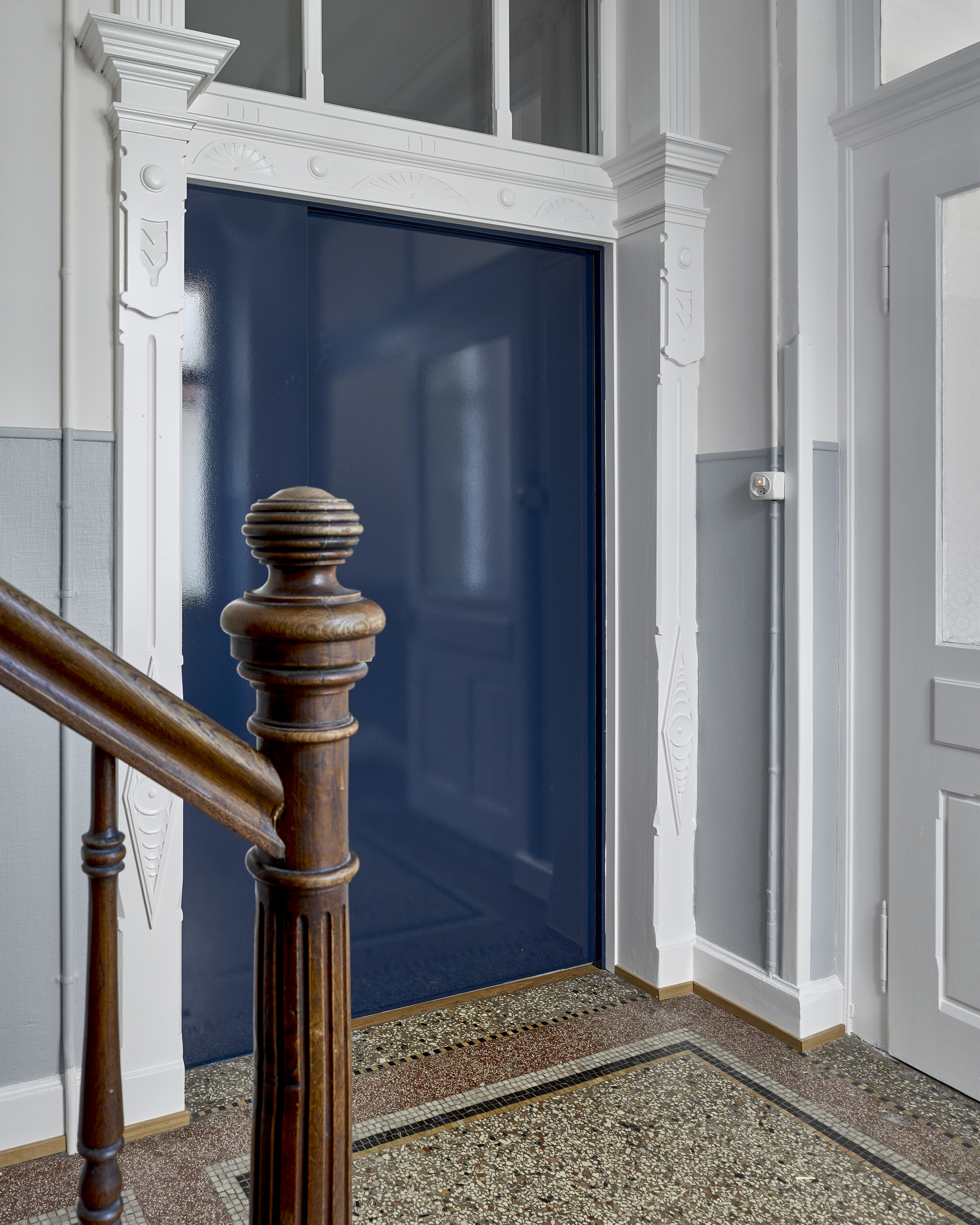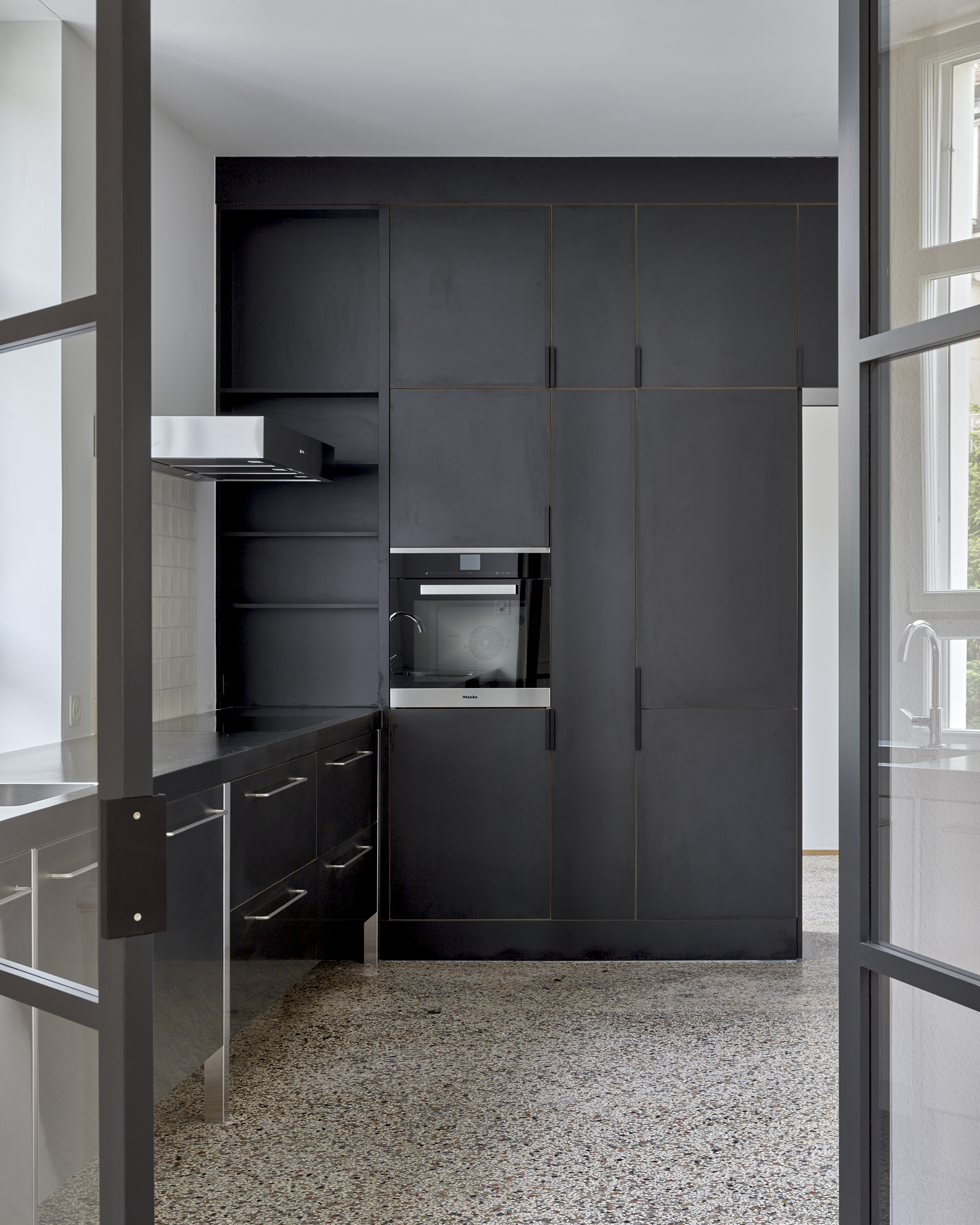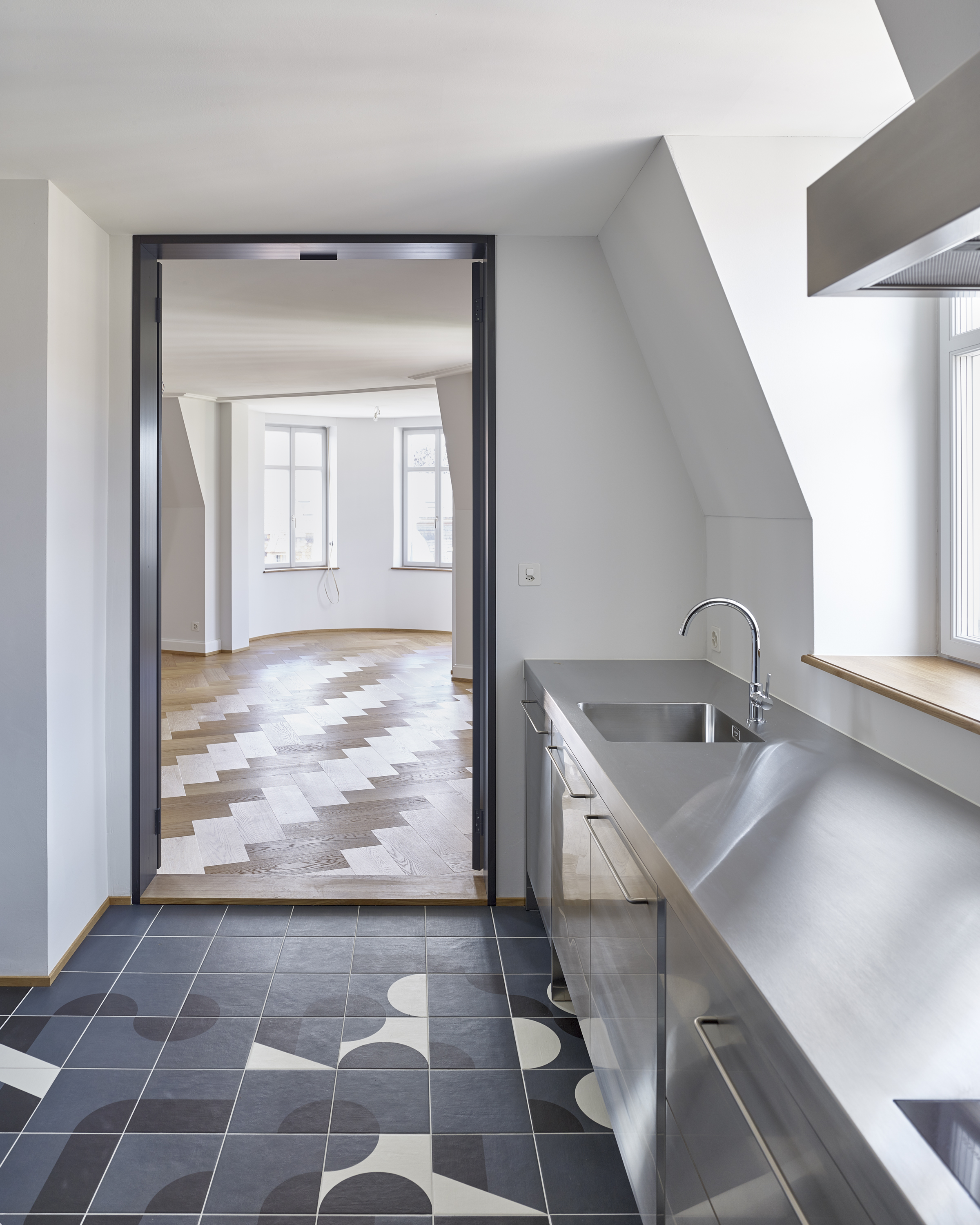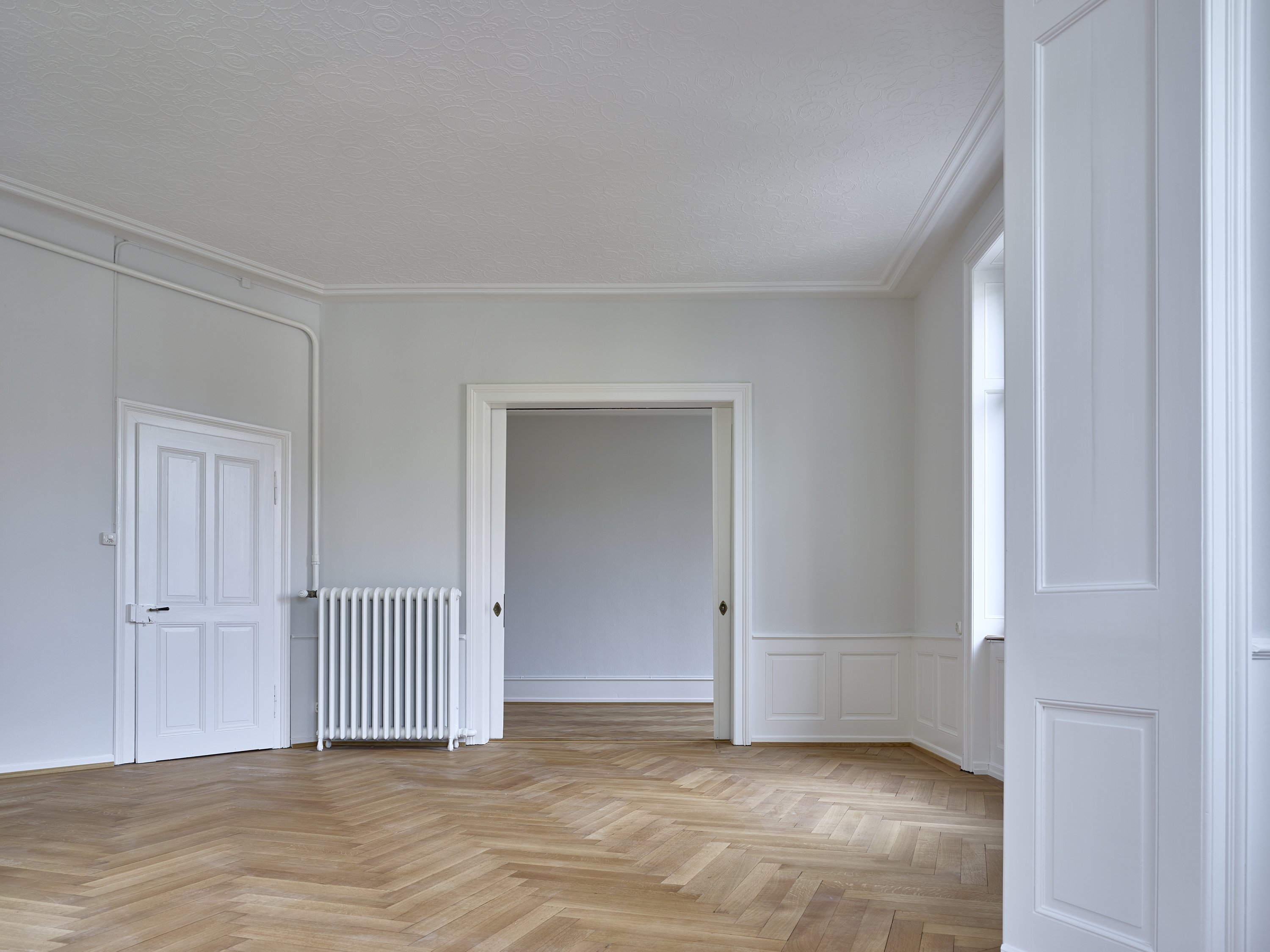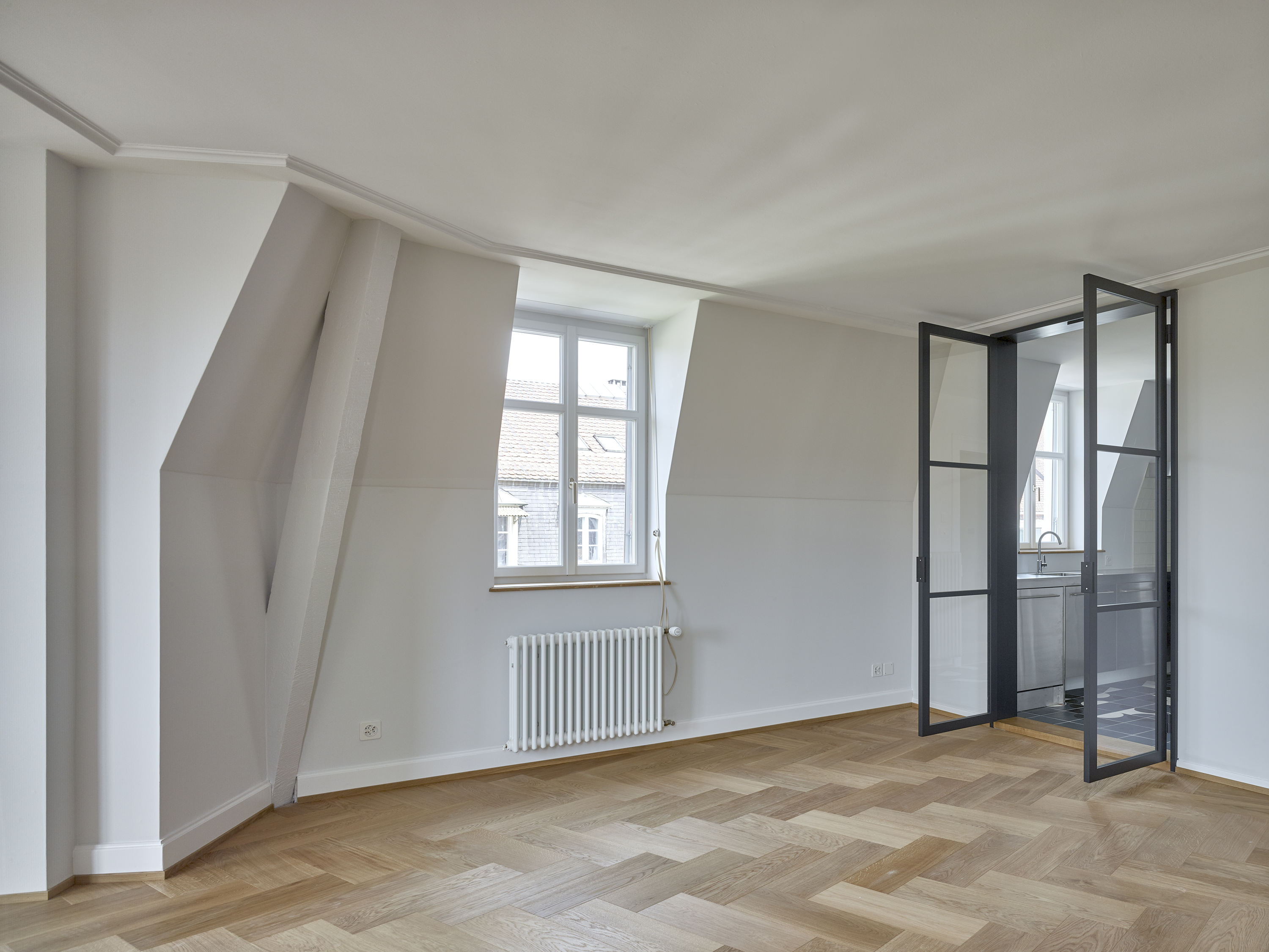 Im Inneren wurden die grossbürgerlichen Raumfolgen sorgfältig saniert. Als neues Element erhielt jede Wohnung eine grosszügige Küche, welche sich über transparente Doppelflügeltüren mit der bestehende Raumfolge verbindet. Eine besonders sorgfältige Material- und Farbwahl schaffen eine neue Grosszügigkeit in den kleinen Bädern.