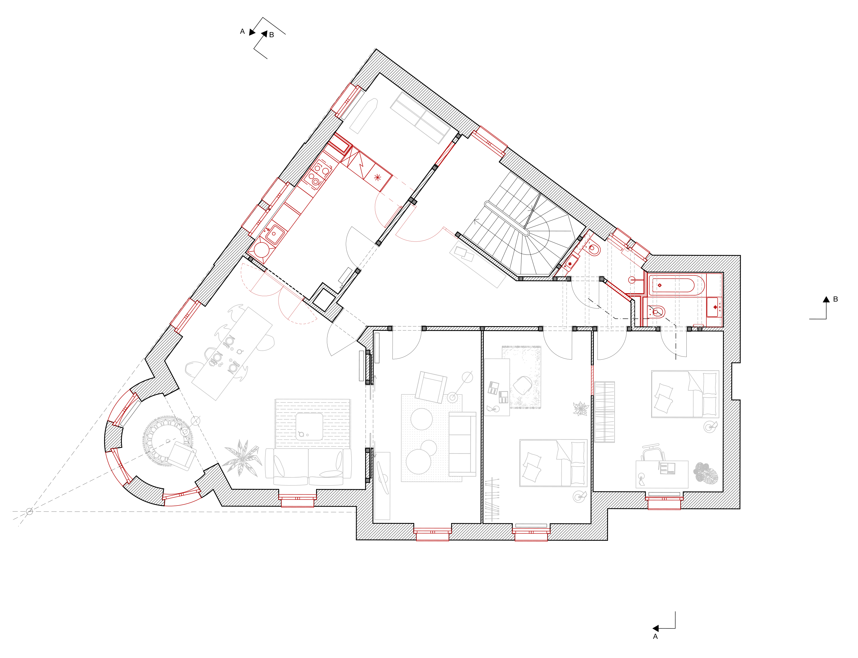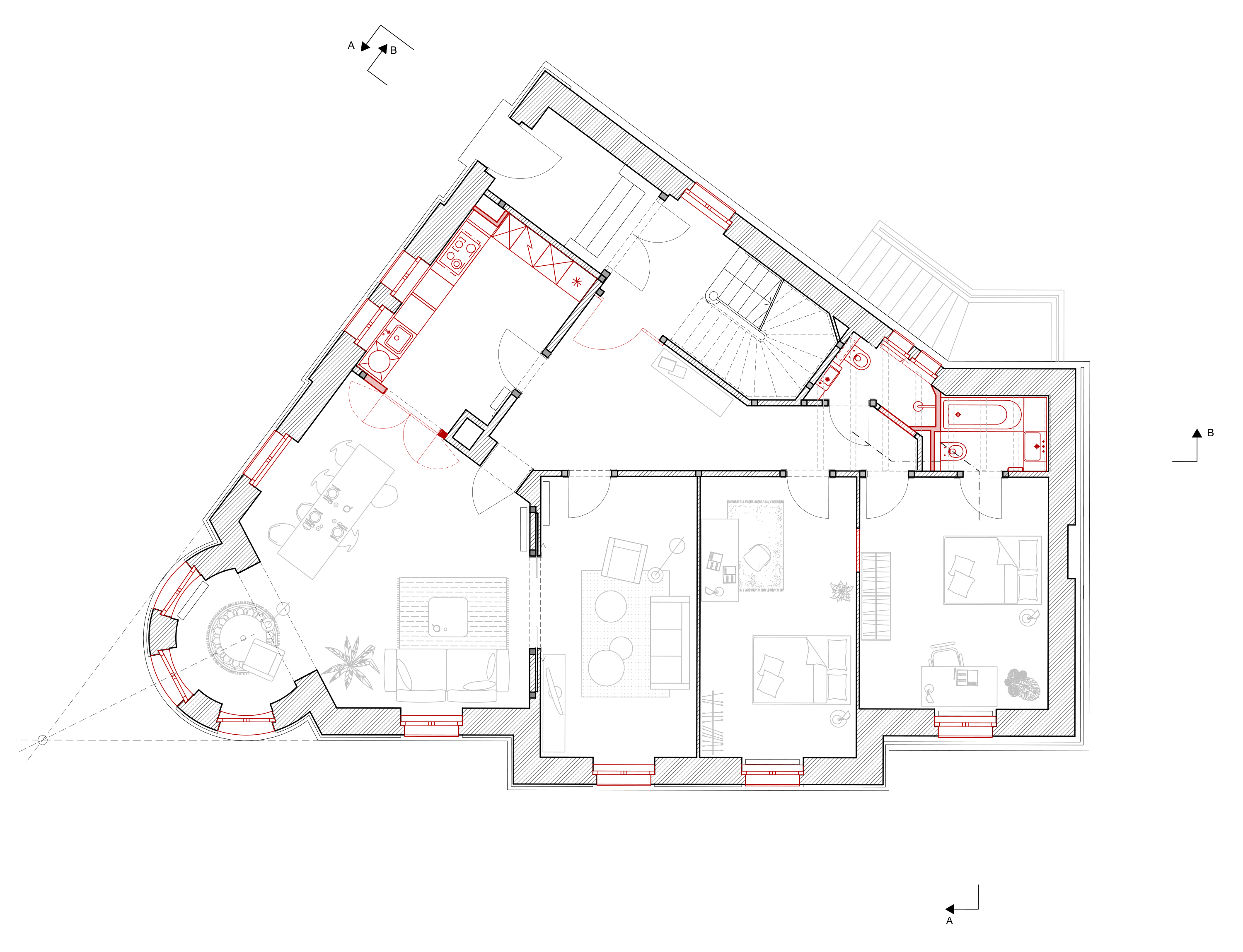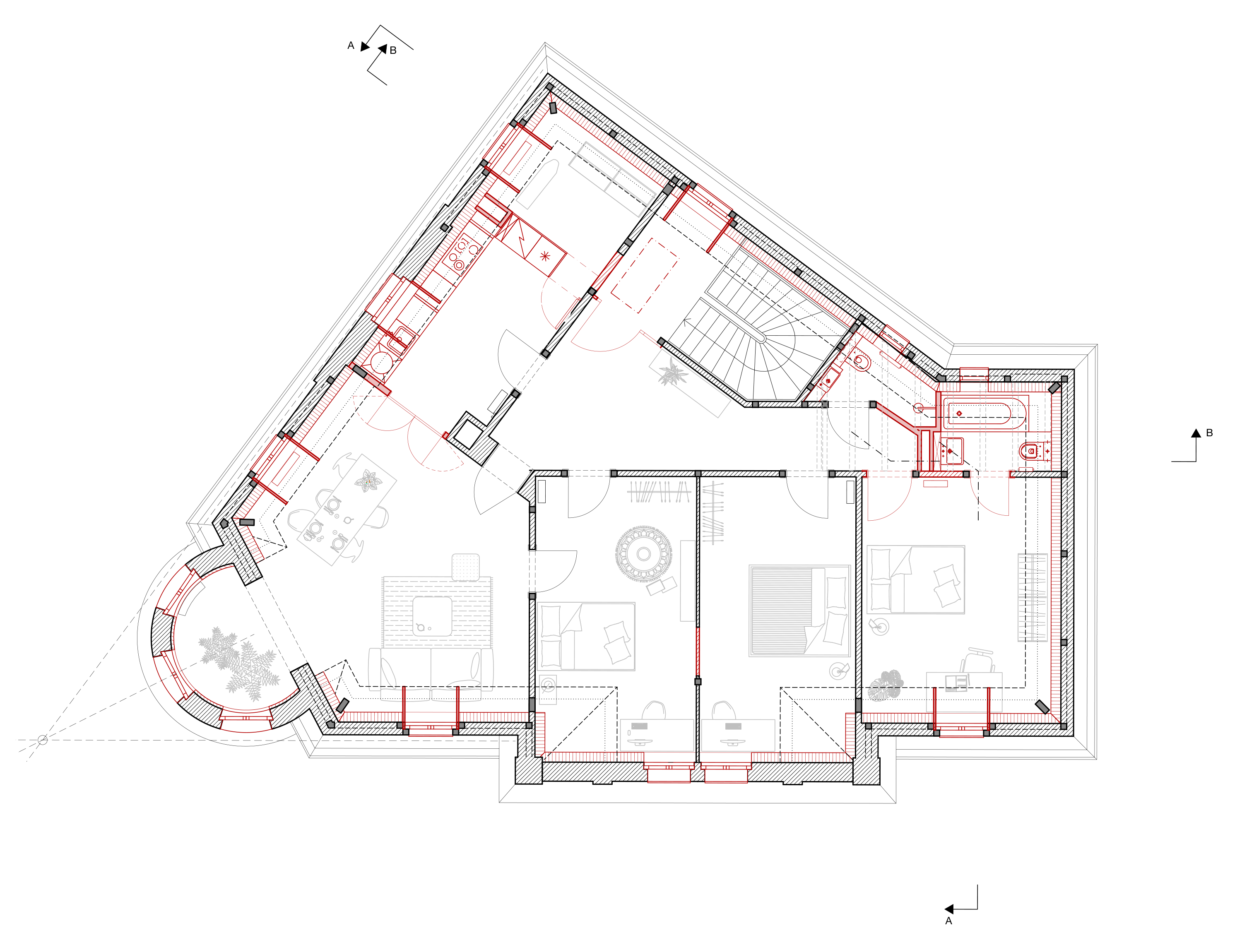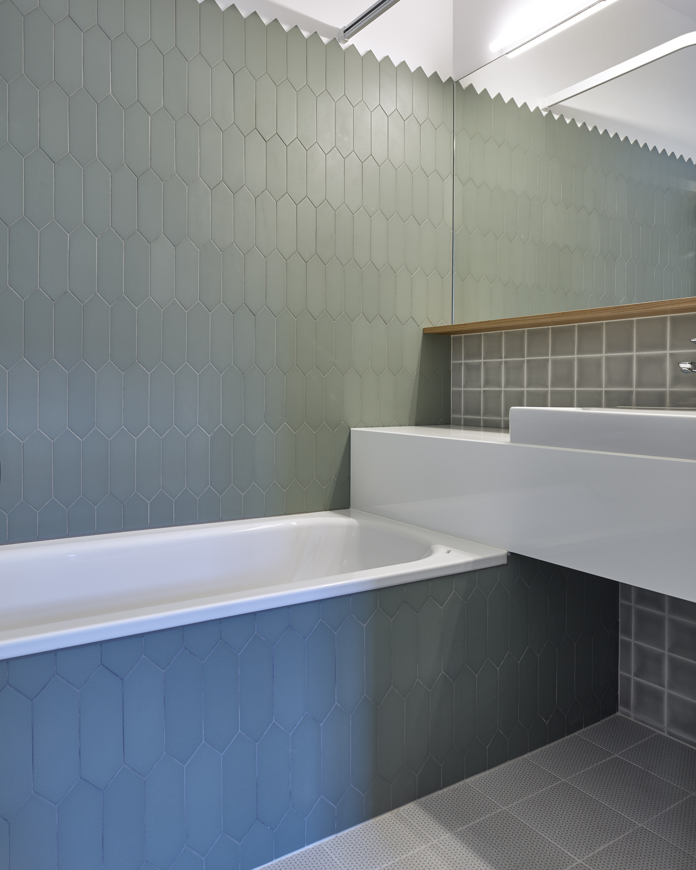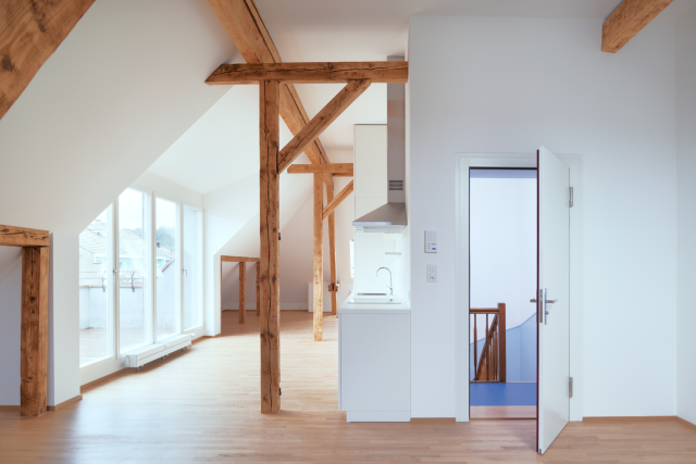 Im Inneren wurden die grossbürgerlichen Raumfolgen sorgfältig saniert. Als neues Element erhielt jede Wohnung eine grosszügige Küche, welche sich über transparente Doppelflügeltüren mit der bestehende Raumfolge verbindet. Eine besonders sorgfältige Material- und Farbwahl schaffen eine neue Grosszügigkeit in den kleinen Bädern.