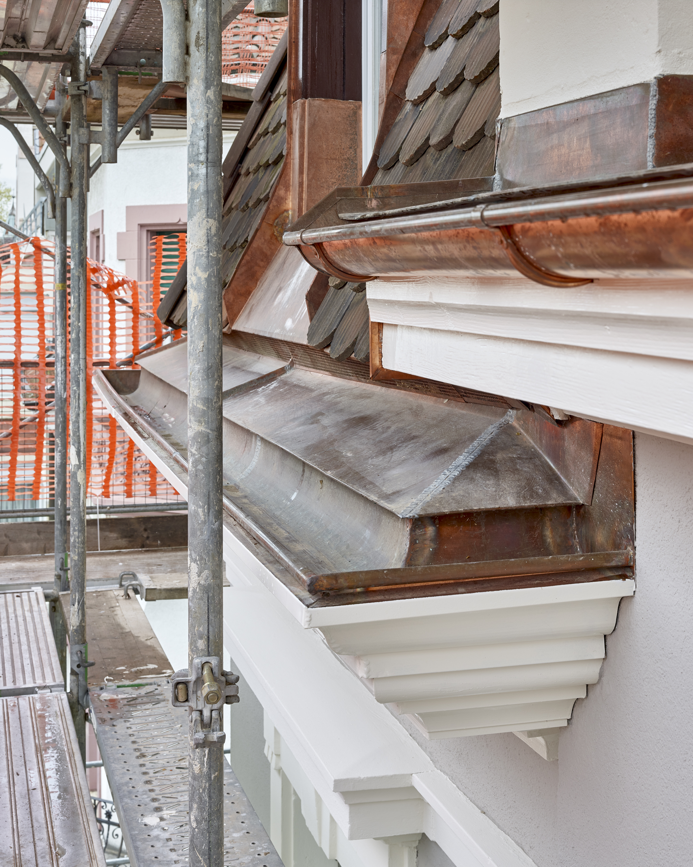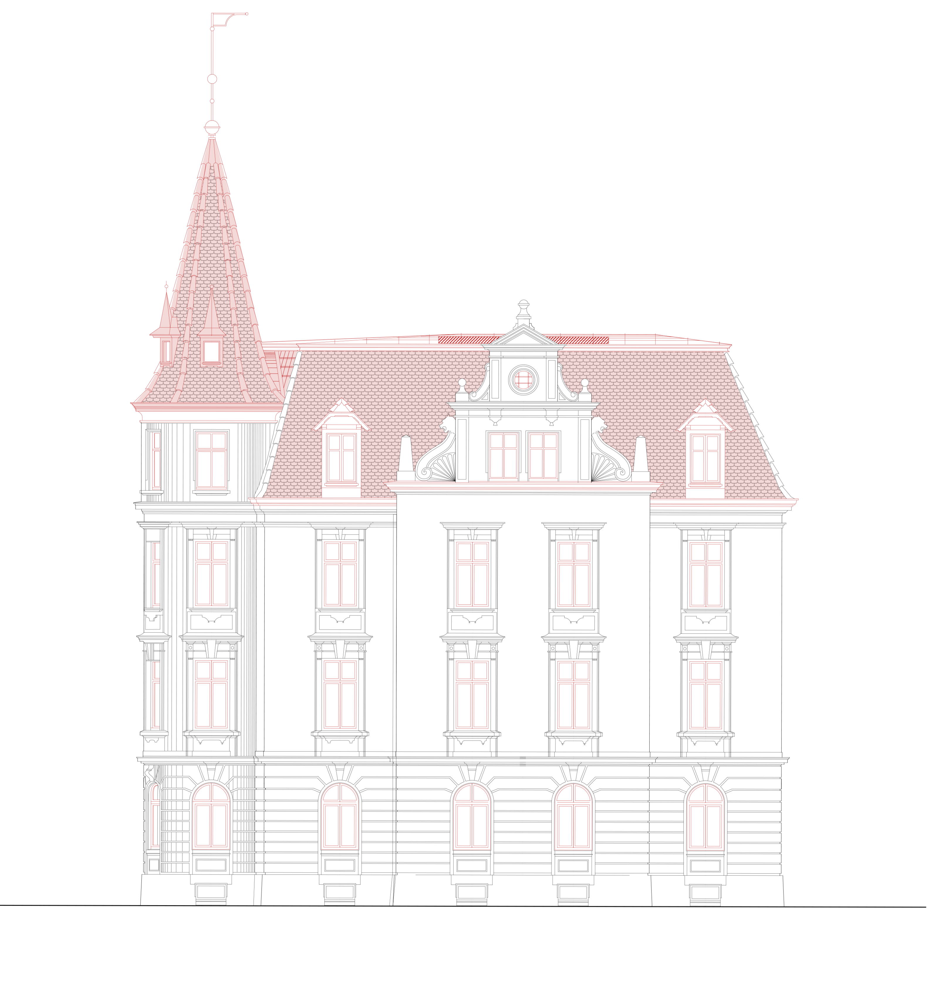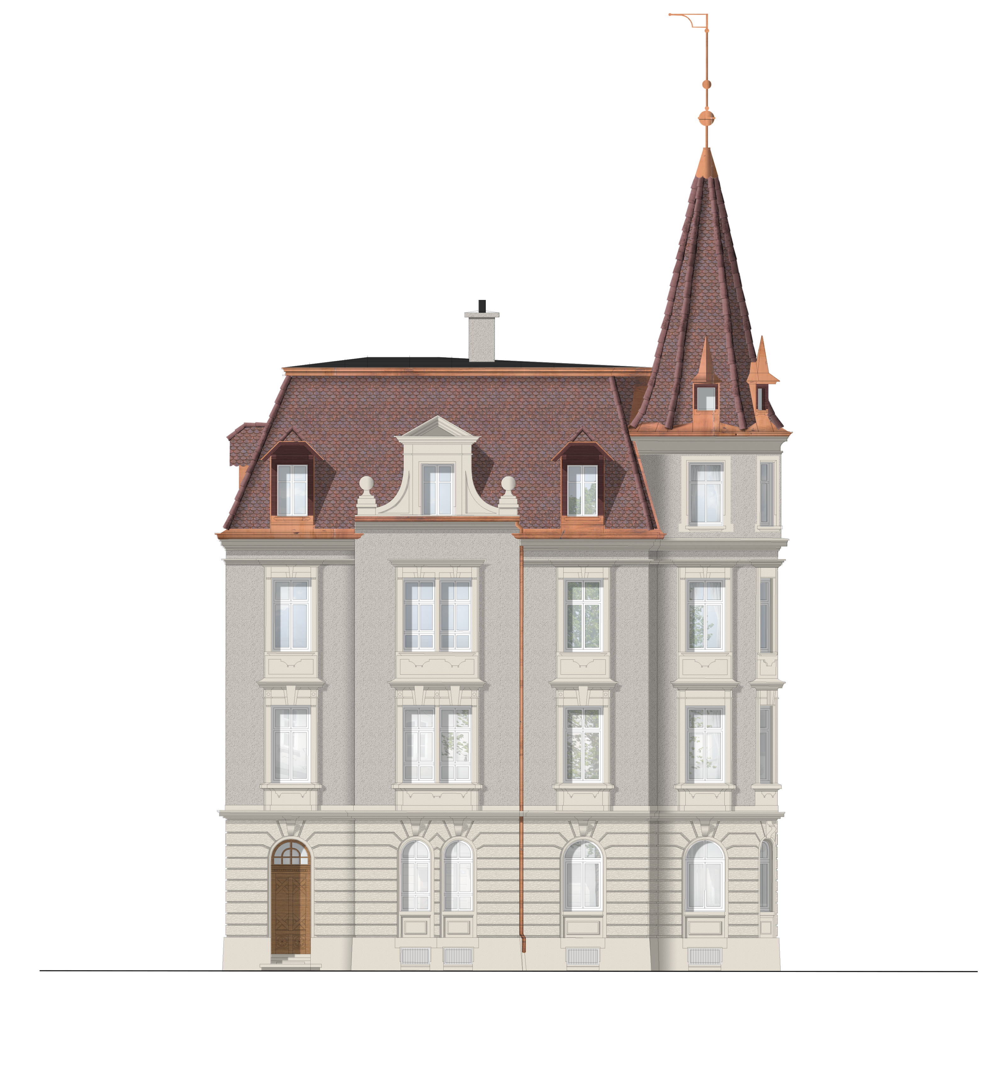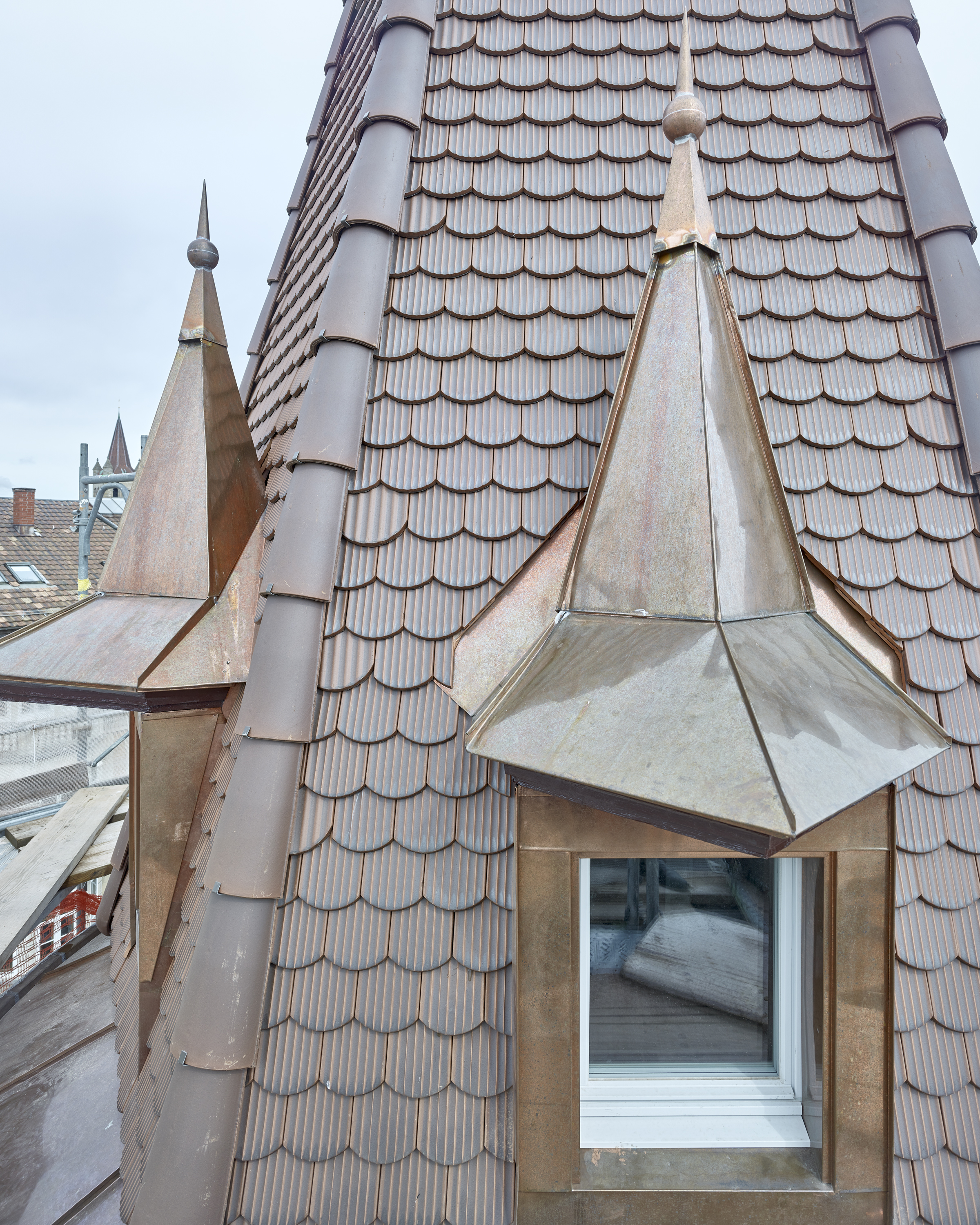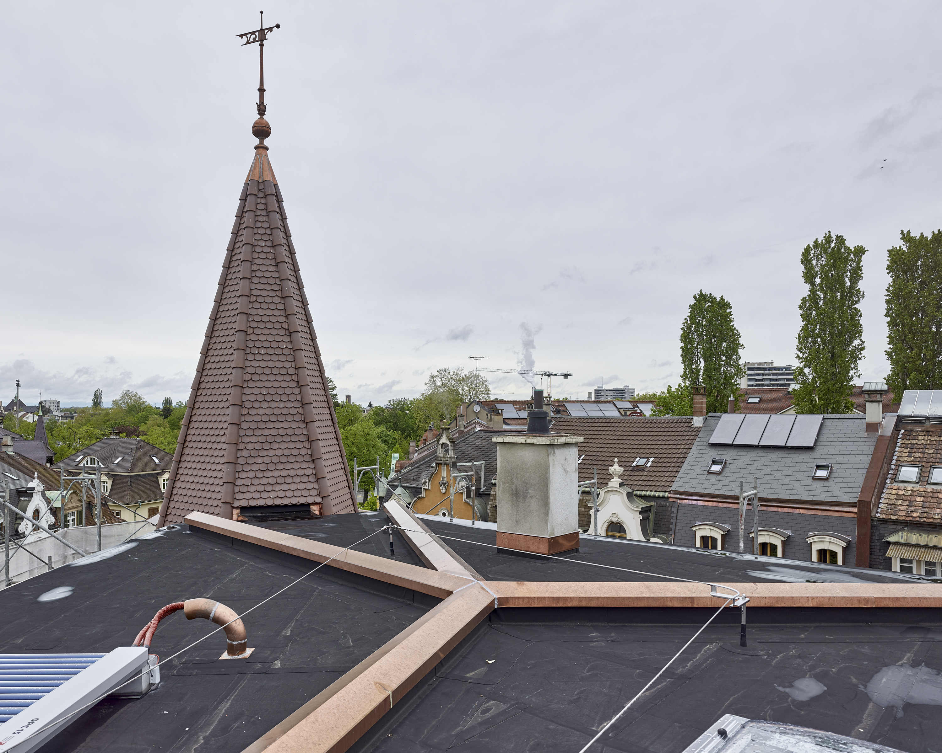 Das gesamte Dach inklusive aller Gauben wurde gedämmt und die aufwändigen Spenglerarbeiten wurden erneuert. Im Mansardengeschoss wurde eine zusätzlich Wohnung eingebaut. Die Fenster aus den siebziger Jahren wurden mit, dem historischen Charakter entsprechenden, Holzfenstern ersetzt. Der Erhalt möglichst aller historischen Bauelemente stand im Vordergrund. Wo immer möglich wurde repariert und ergänzt.