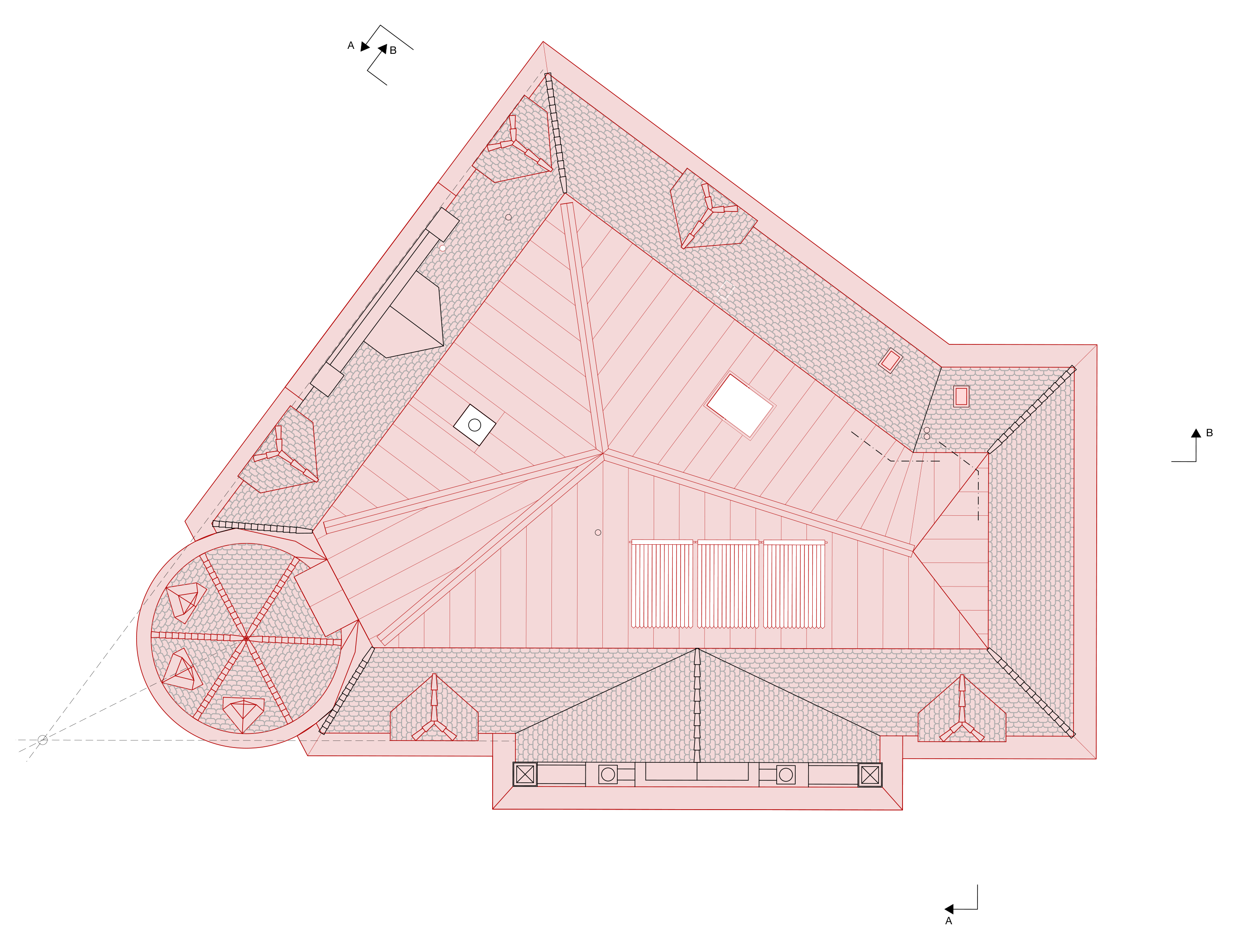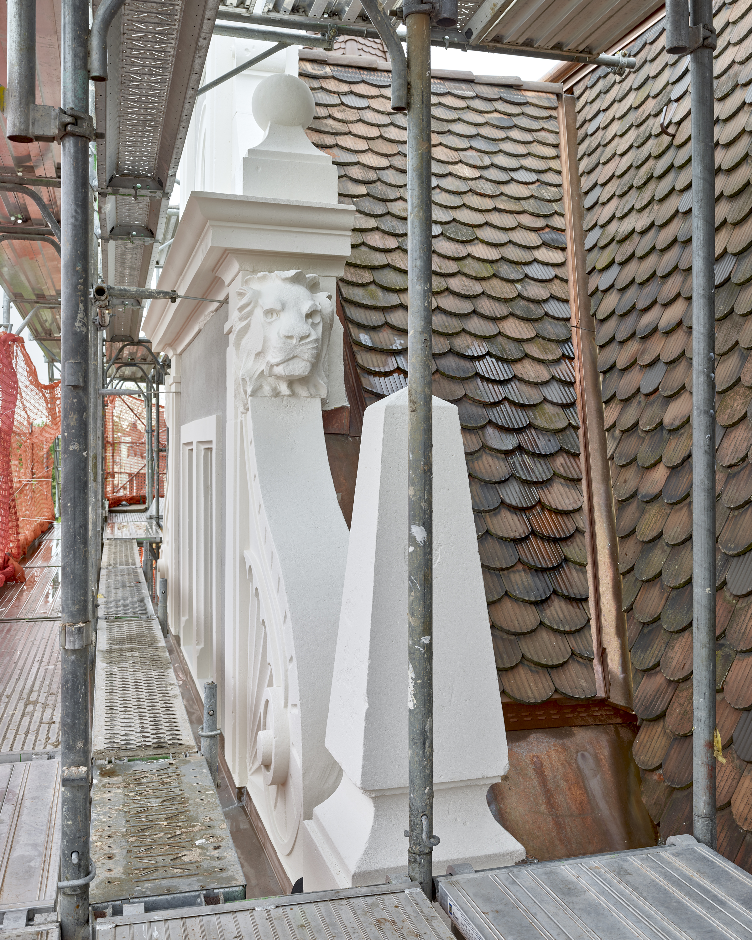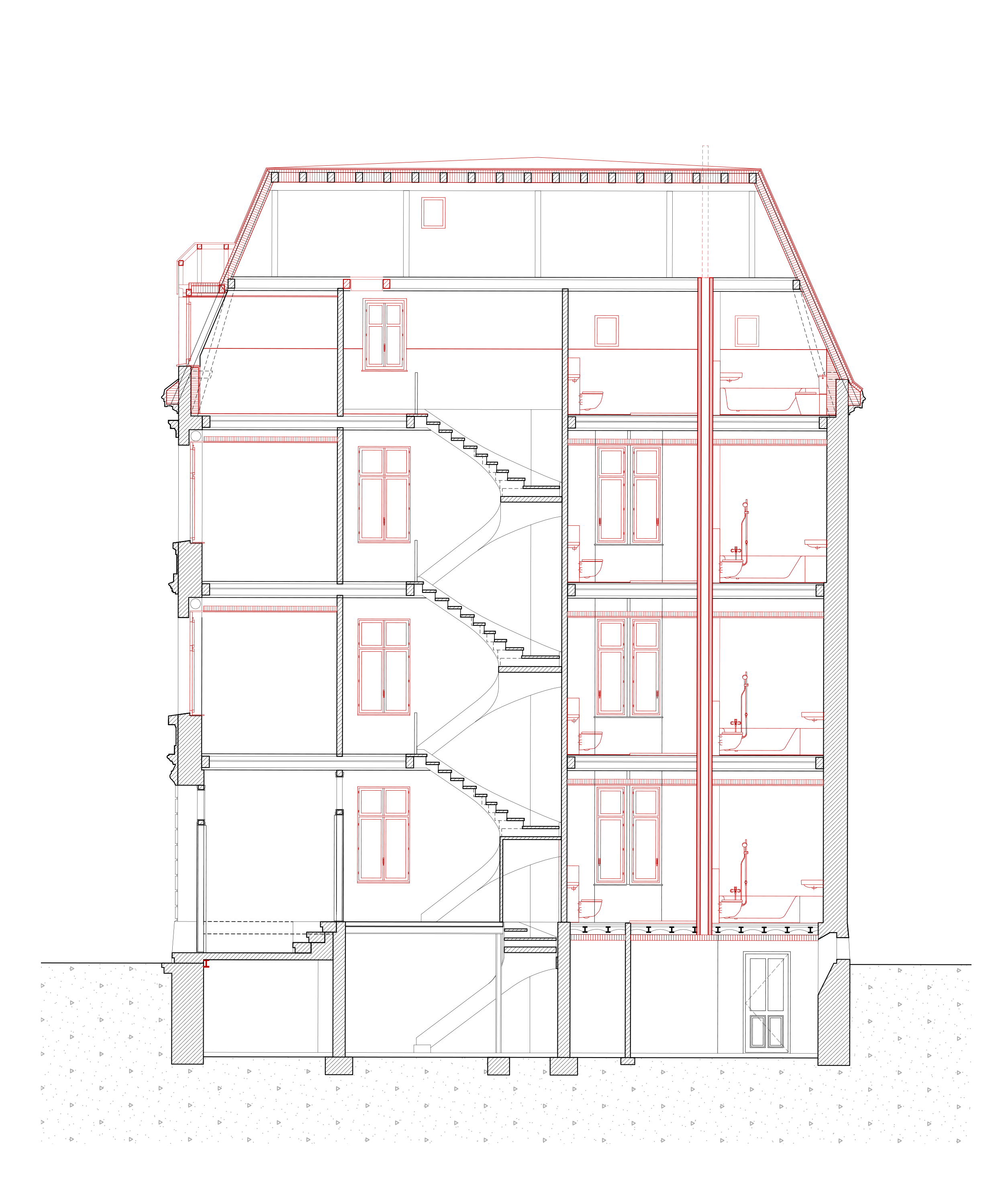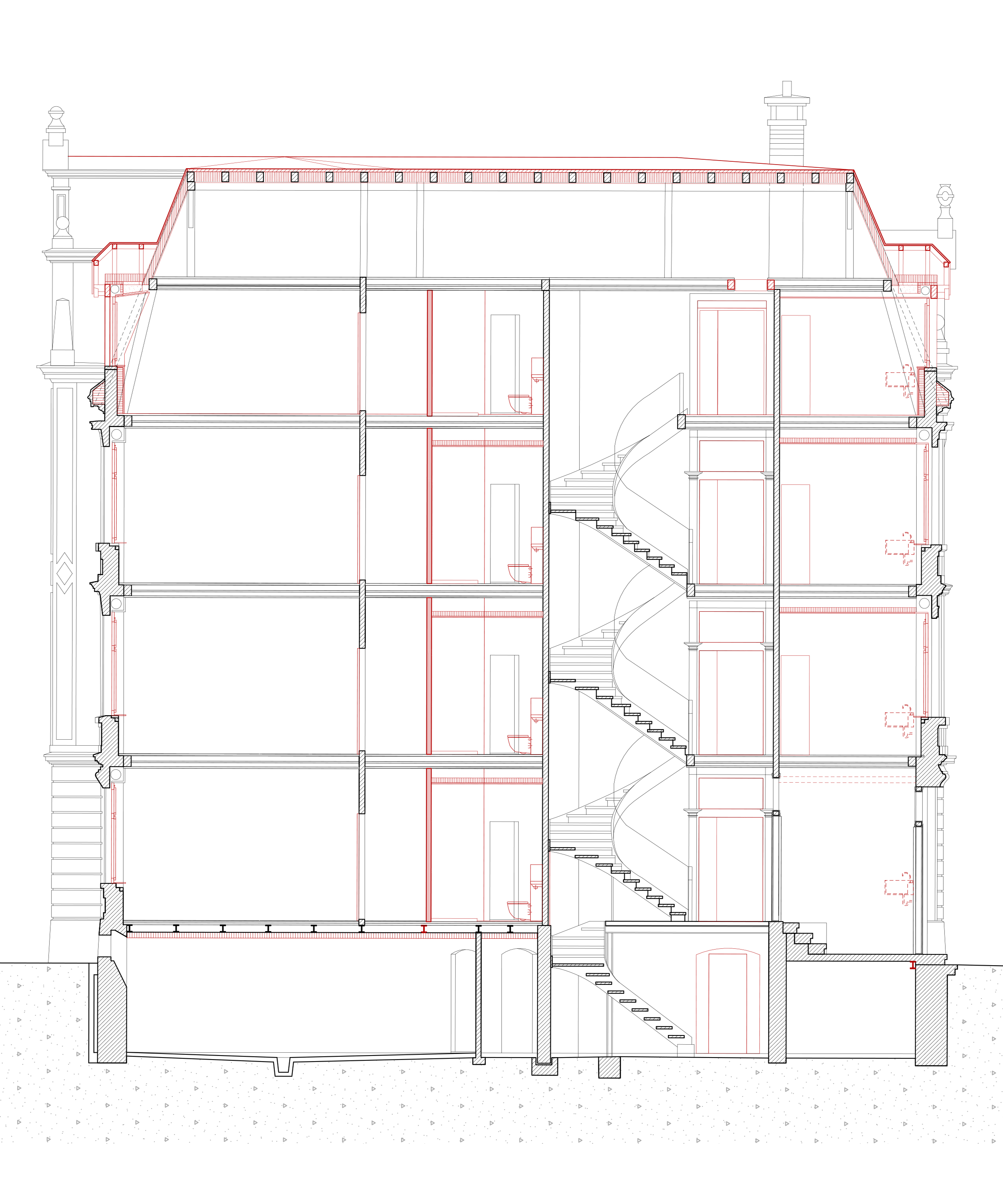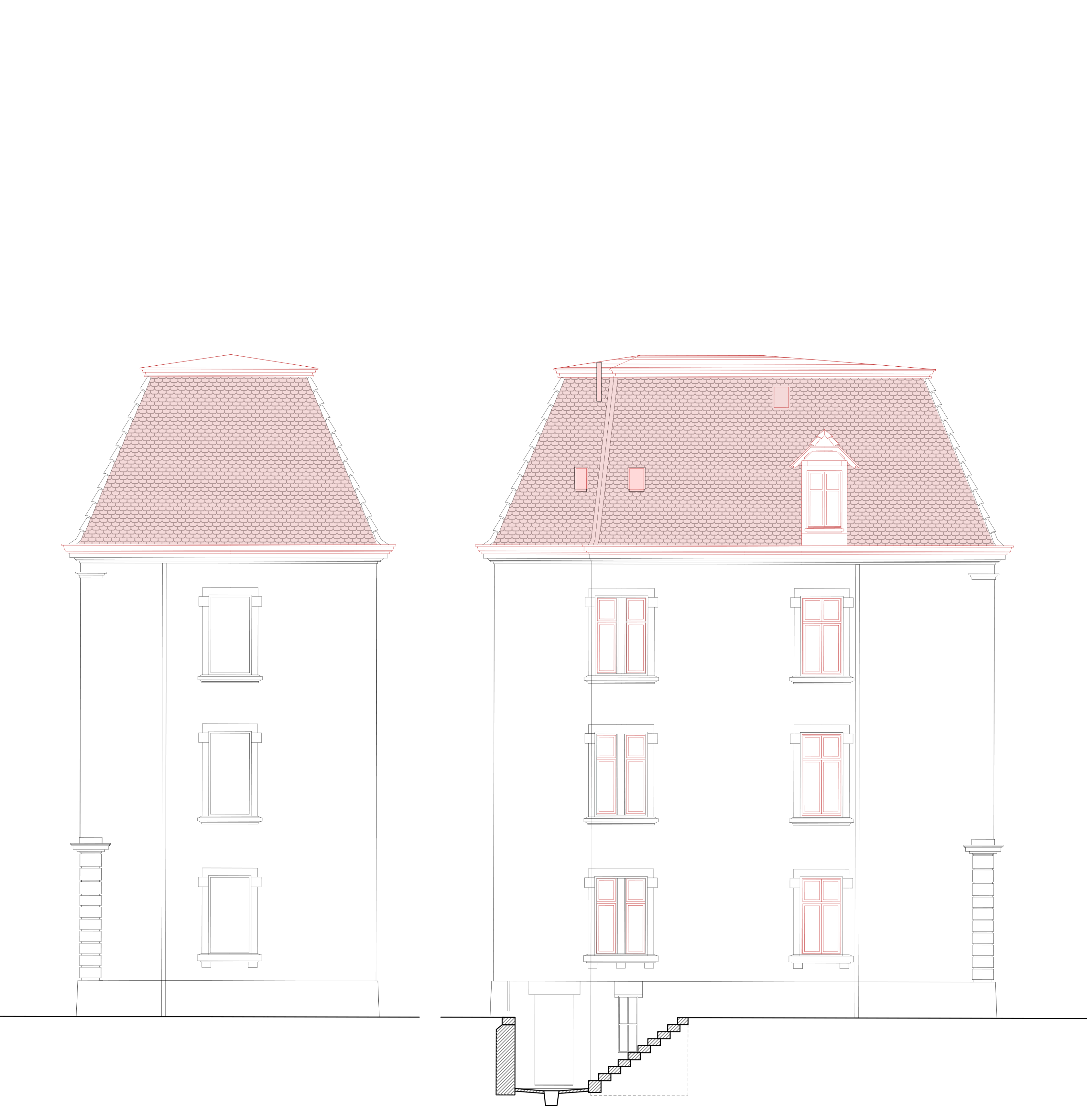 Das gesamte Dach inklusive aller Gauben wurde gedämmt und die aufwändigen Spenglerarbeiten wurden erneuert. Im Mansardengeschoss wurde eine zusätzlich Wohnung eingebaut. Die Fenster aus den siebziger Jahren wurden mit, dem historischen Charakter entsprechenden, Holzfenstern ersetzt. Der Erhalt möglichst aller historischen Bauelemente stand im Vordergrund. Wo immer möglich wurde repariert und ergänzt.