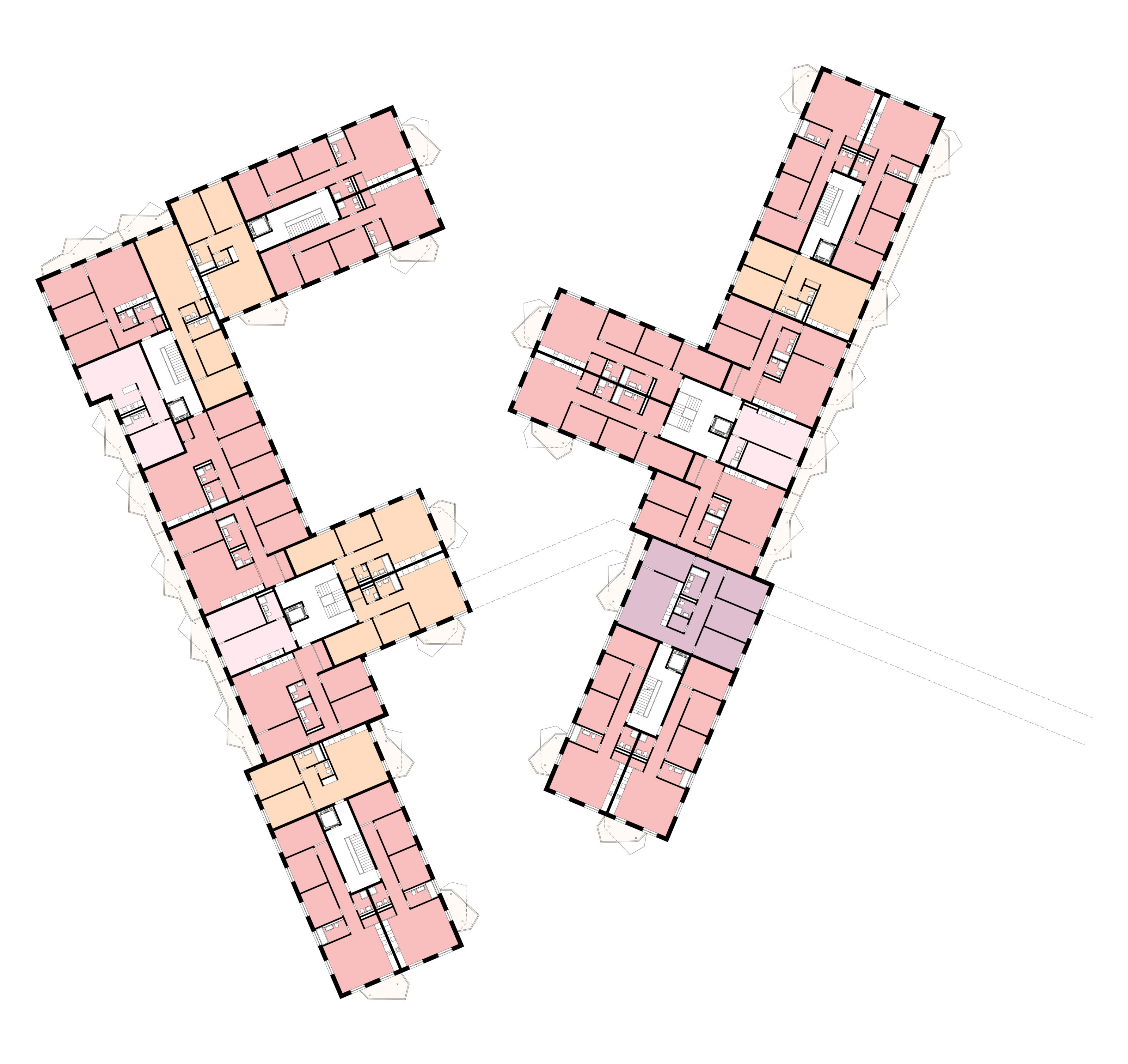 Die Strenge dieser pragmatischen Grunddisposition wird durch die spielerisch anmutende Positionierung der Balkone gelockert. Sie sind als konstruktiv unabhängige Stahlkonstruktionen vor den aussen gedämmten Fassaden angeordnet. Jeder Balkon misst 9m2 Grundfläche und wird im Wechsel übereinander gespiegelt angeordnet, so dass je ein gedeckter und ein freier Balkonteil entstehen. Bei den Strassen- bzw. Zugangsseiten werden die Balkone zudem untereinander verbunden, wodurch eine feingliedrige Gesamterscheinung erreicht wird.